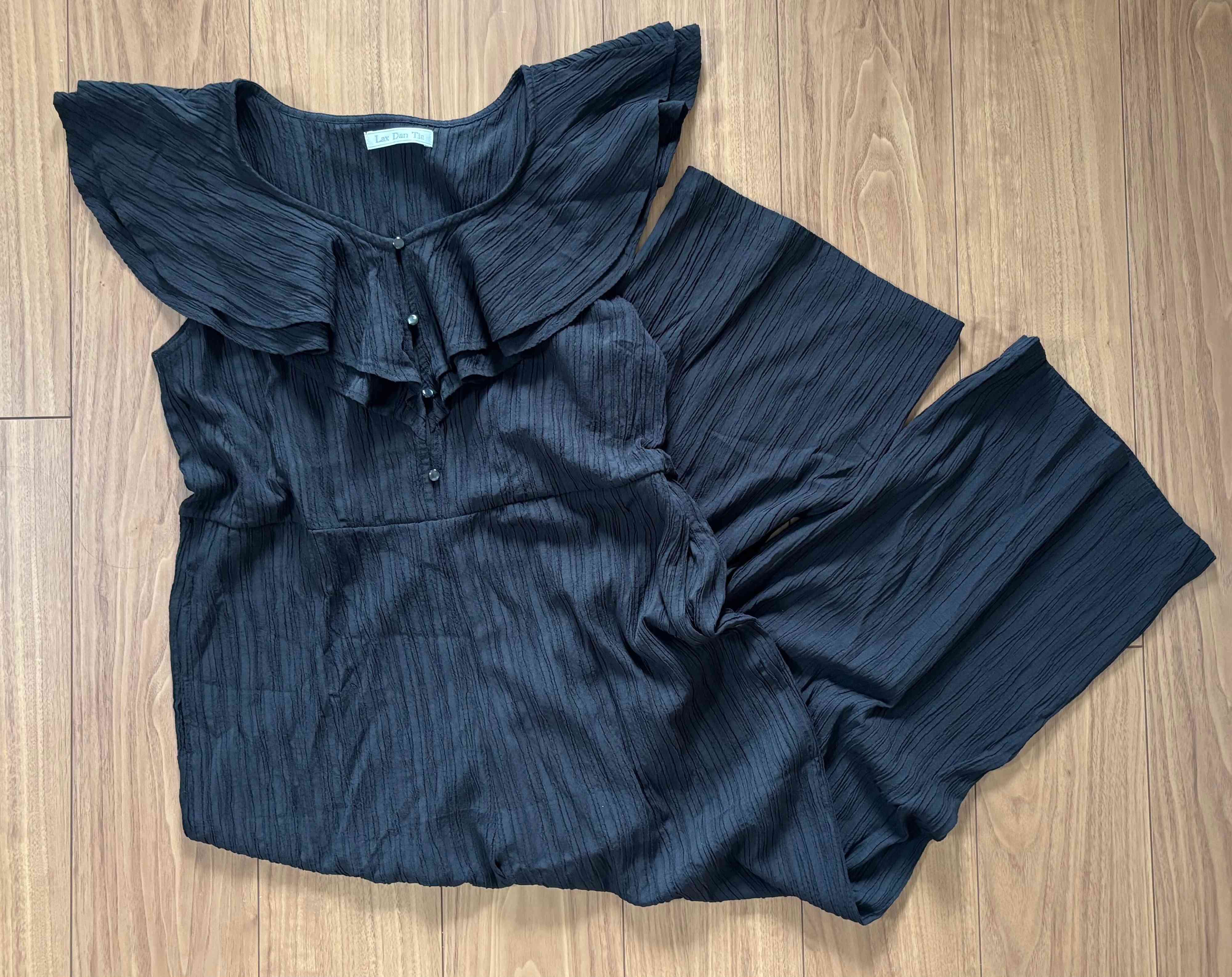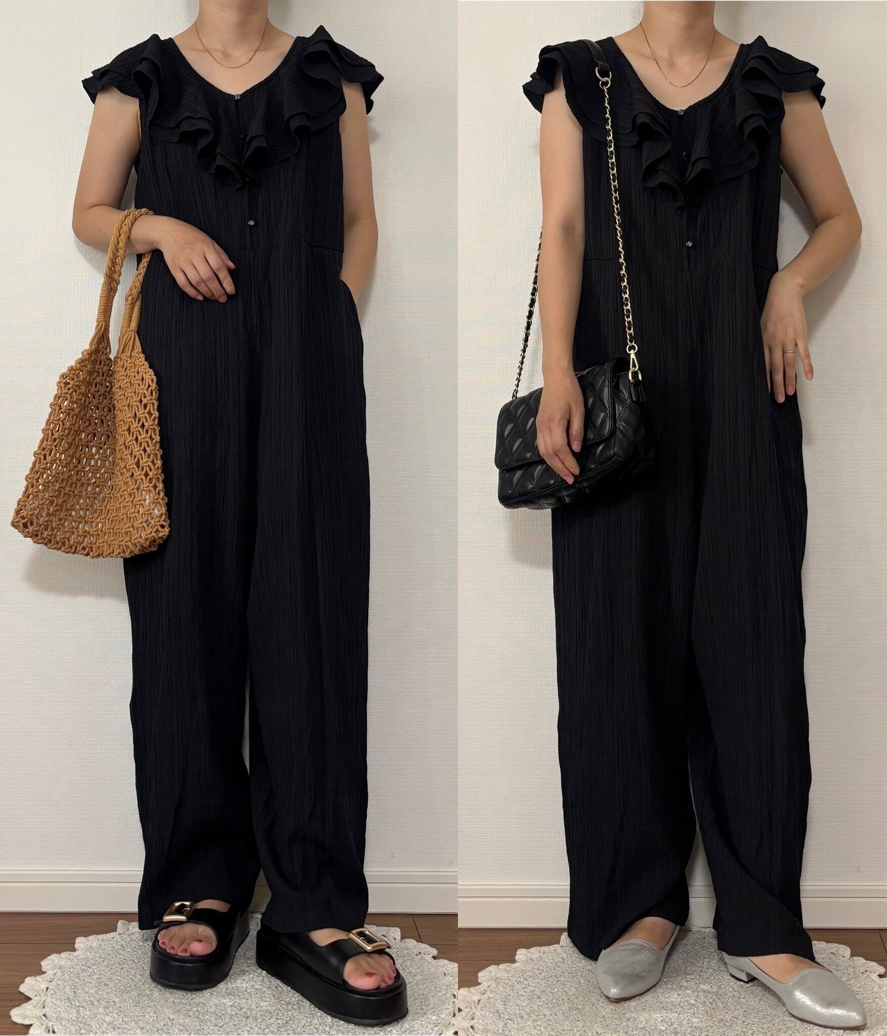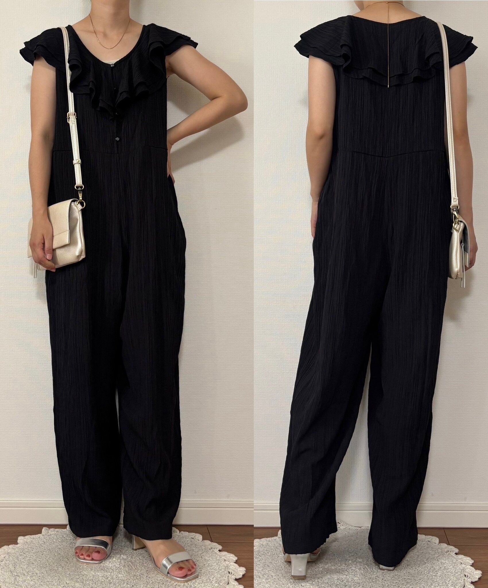 こちらのオールインワンは暑い日もストレスなく着ることができるうえに、夏らしい素材と首元のフリルでトレンド感も兼ね備えたいいとこ取りの万能な一枚です。