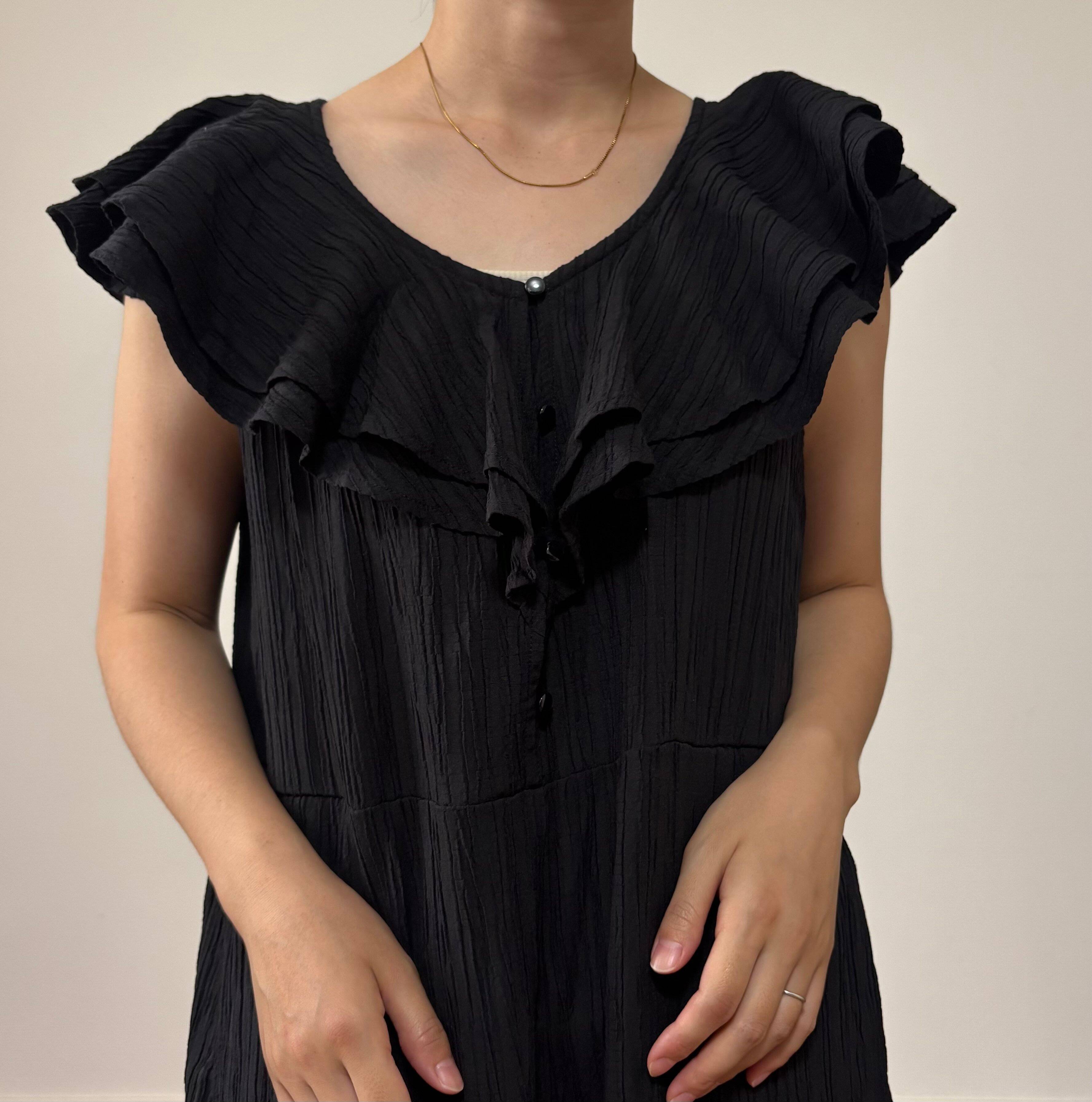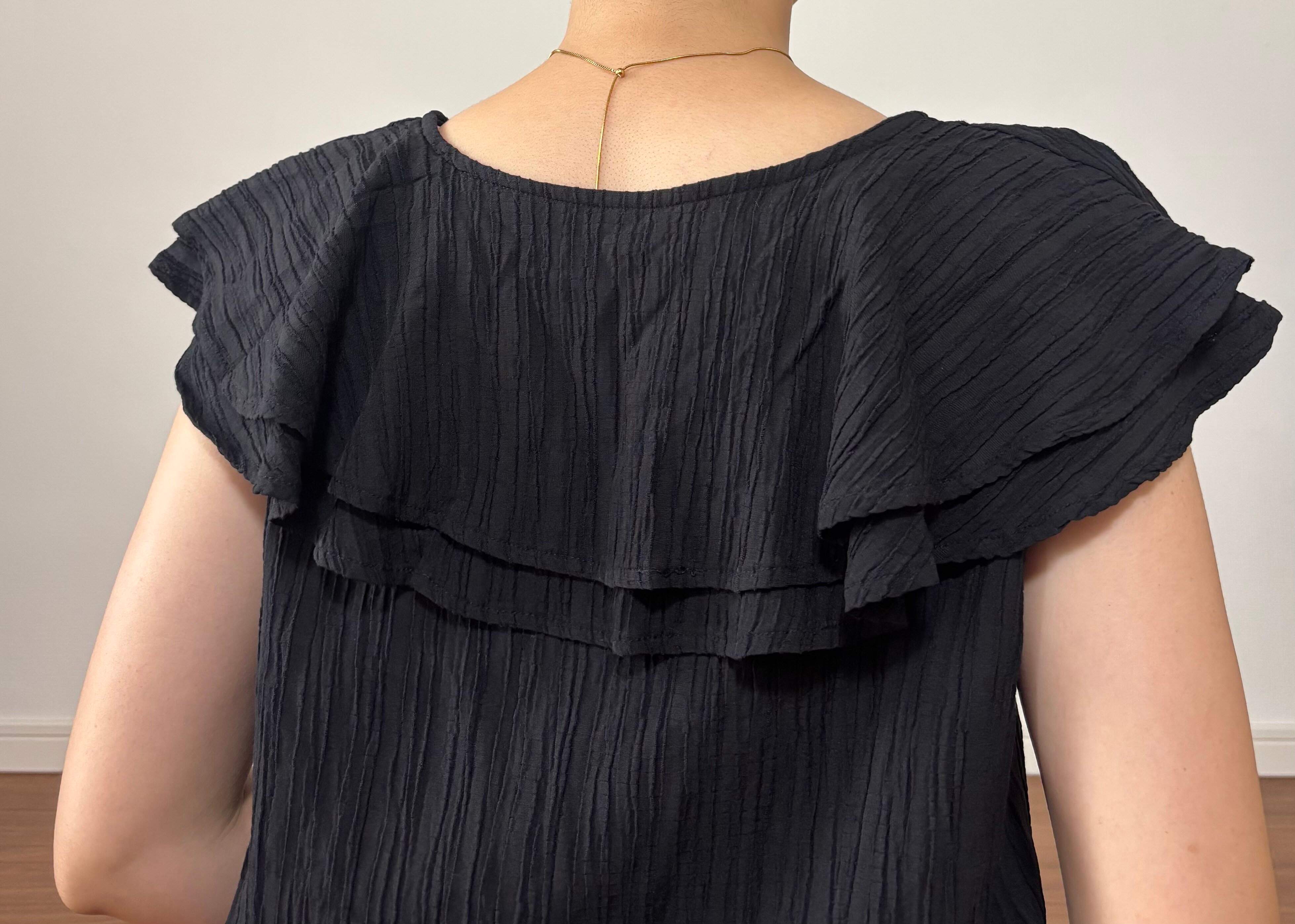 襟元の大胆なフリルがポイント。カラーがブラックなのでかわいくなりすぎず、大人女子でも着やすい上品な印象にまとまります。