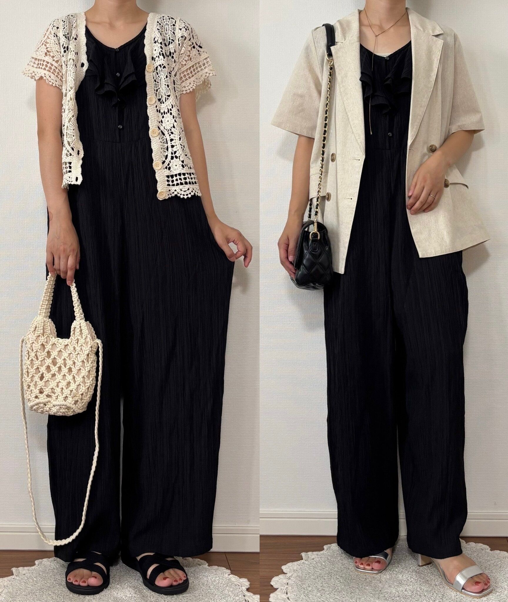 大人ブラックのオールインワンは、小物を変えることで全体の印象もがらりと変わります。