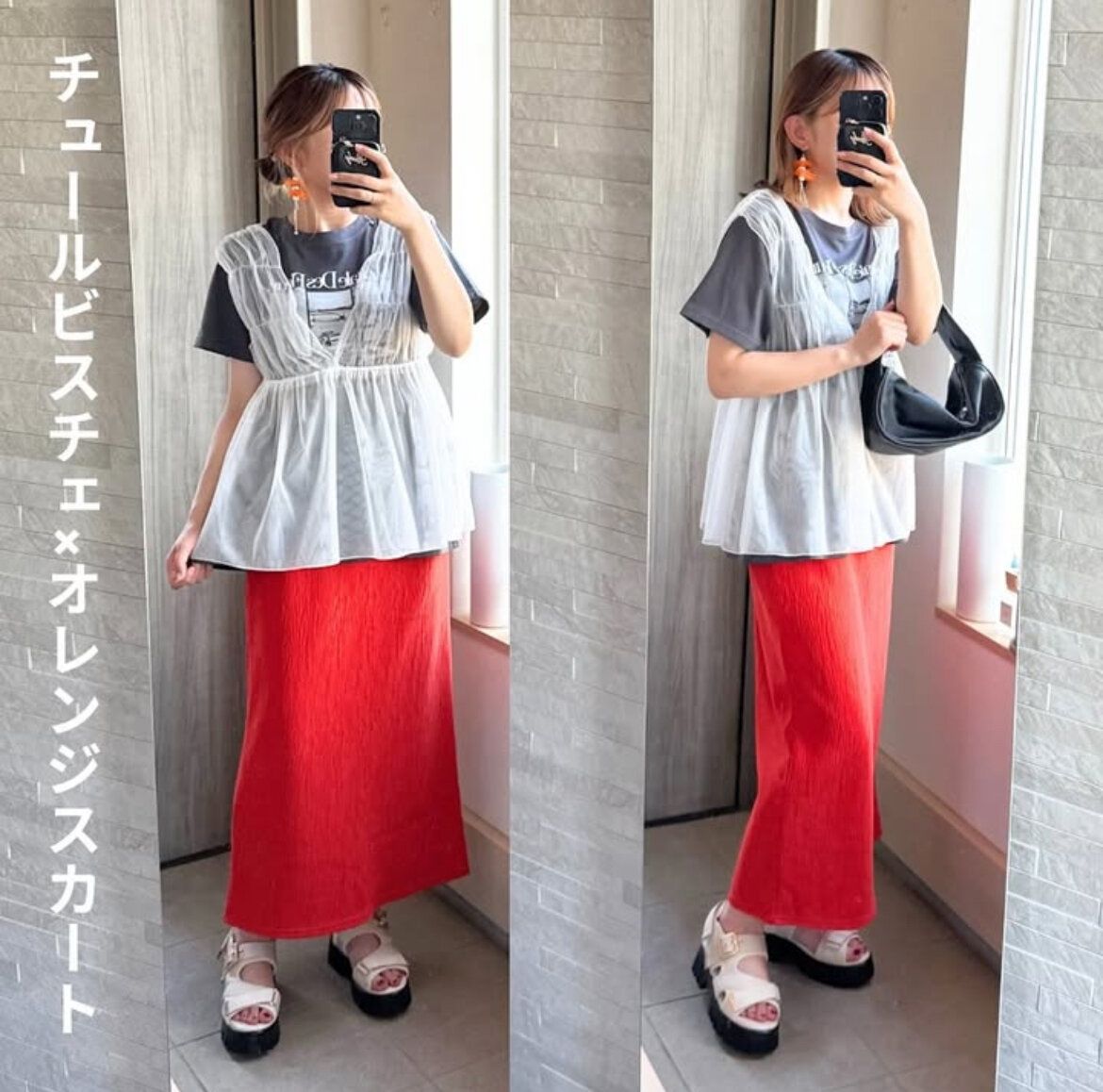 しまむらの人気アイテム「ナロースカート」とも「チュールビスチェ」は相性抜群! Iラインのシルエットの中に「チュールビスチェ」をプラスすることでコーディネートに動きがプラスされ印象をガラリと変えてくれます。ちょっぴり周りと差をつけたい人はぜひチャレンジしてみて♪