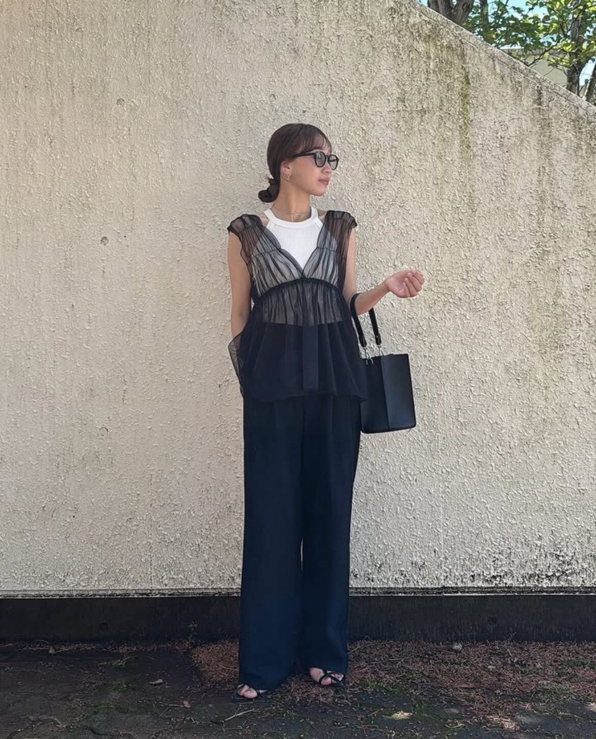 ふんわりカワイイ印象の「チュールビスチェ」を大人っぽく着用したい場合はモノトーンコーディネートがおすすめ。黒の比率をやや多めにすればよりクールな印象を演出できます。特にブラックの「チュールビスチェ」はハンサムコーディネートが好きなアラフォー女性でも着回ししやすいですよ。
