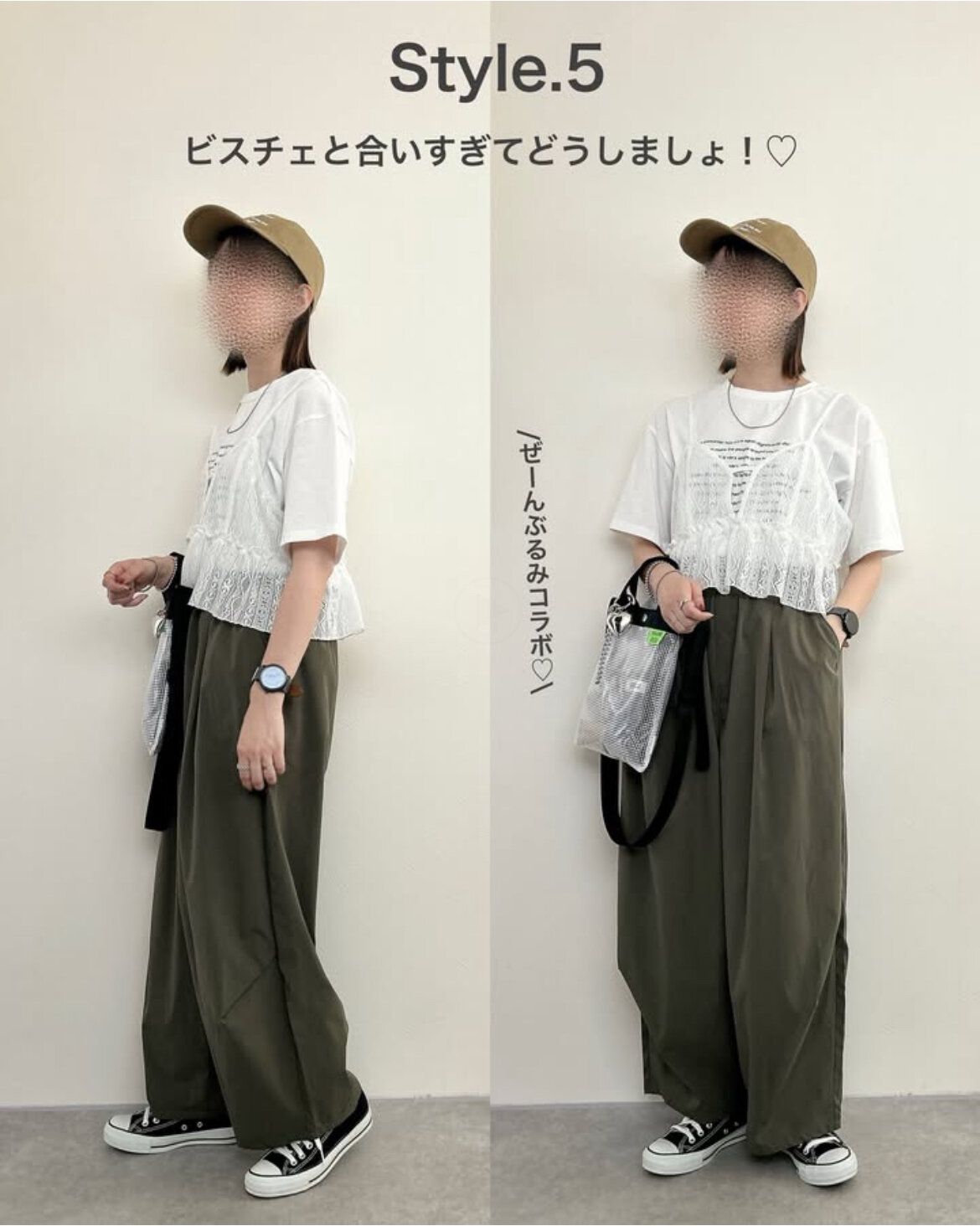 オーバーサイズのTシャツにゆったりとしたボトムスをあわせたゆるっとコーディネートも素敵ですが、レースビスチェをあわせることでメリハリができ、コーディネートがよりスタイリッシュな印象に仕上がります。こなれ感も演出できおしゃれ上級者になれちゃう♪