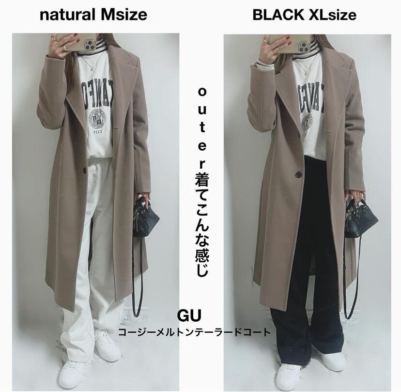 きれいめスタイルでも重宝するロングテーラードコートを合わせれば、こなれた大人カジュアルスタイルが完成! 中綿アウターやボアジャケットなどカジュアルなアイテムとももちろん相性抜群ですが、あえてきれいめなアイテムを合わせることでワンランク上のおしゃれさんの印象を与えることができちゃいます。スウェットバレルレッグパンツと同じGUで購入できるコージーメルトンテーラードコートもおすすめ♪