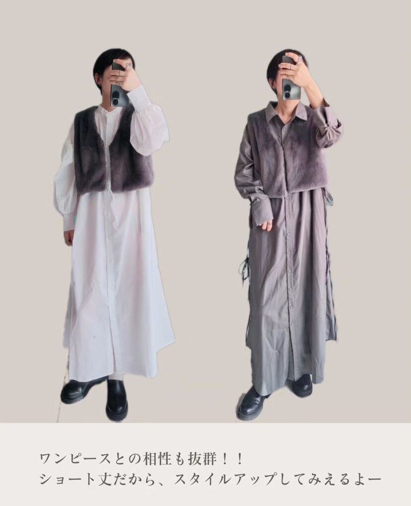 ワンピースにファーベストをプラスするコーディネートは、印象ががらりと変わっておすすめ。とくに長めのシャツワンピースはストンとしたシルエットになりがちなのですが、ファーベストを羽織ればメリハリのある印象を与えてくれます。