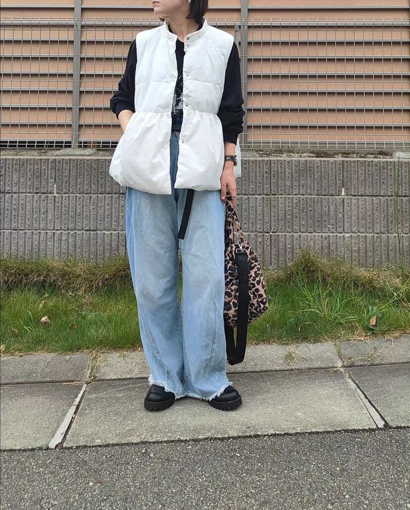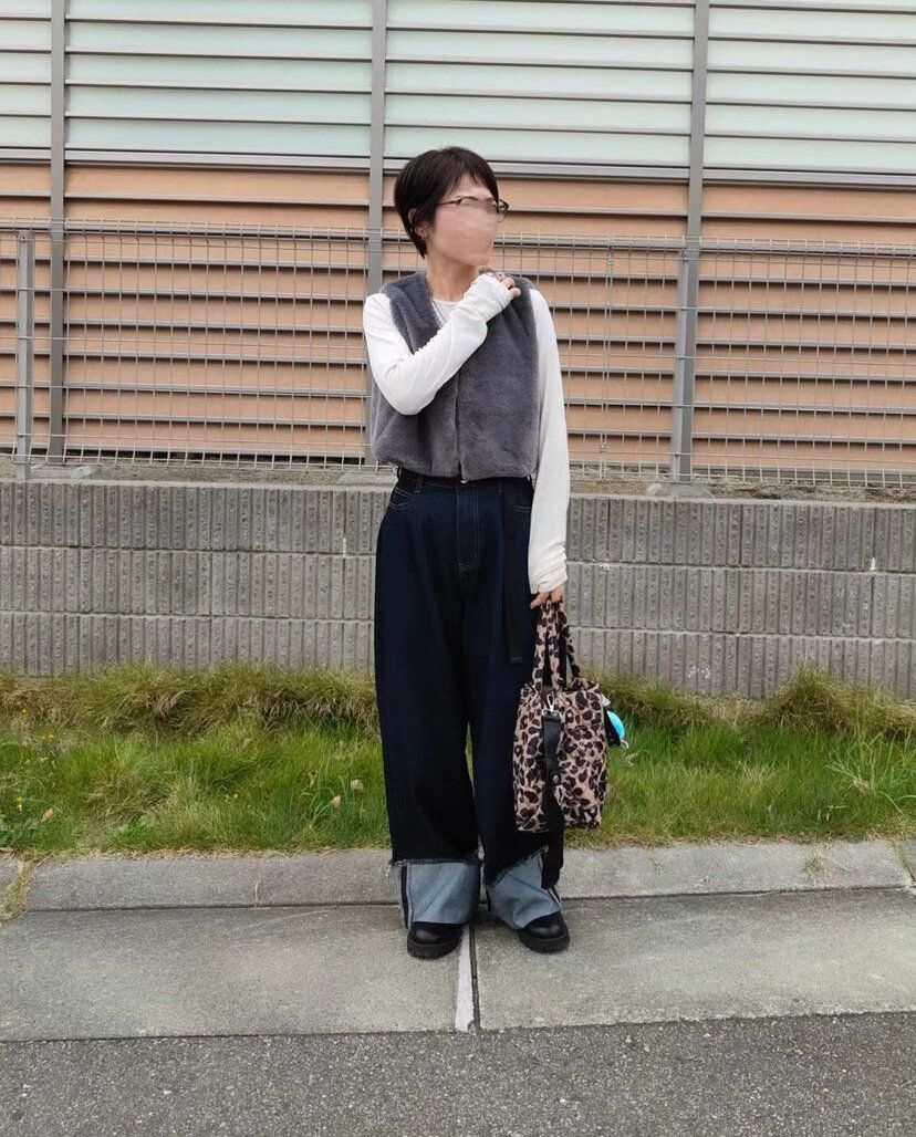 組みあわせによってはカジュアルすぎる印象になってしまうデニムも、ファーベストを取り入れればワンランク上のスタイリングが完成。ショート丈なので、メリハリも演出できます。ボリュームのあるボトムスでも大活躍!