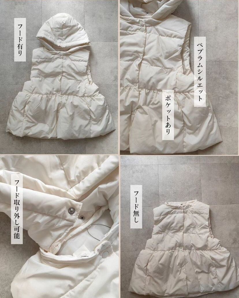 アイボリーのフード付きペプラム中綿ベストは、暗くなりがちな秋冬のコーディネートに明るさをプラスしてくれます。フードを取りはずせば甘すぎないカジュアルスタイルが楽しめます。
