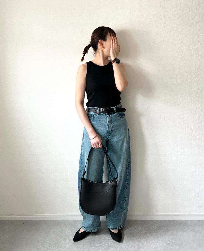 「バレルレッグジーンズ」とは、樽(バレル)のような曲線が印象的な新シルエットのジーンズ。ワイドシルエットと曲線美どちらも叶うジーンズは、下半身のラインを拾わないので着やせ効果も期待できます。履くだけでトレンドを抑えた印象を与えてくれるので、タンクトップとあわせたシンプルなコーディネートもスタイリッシュに仕上がります。