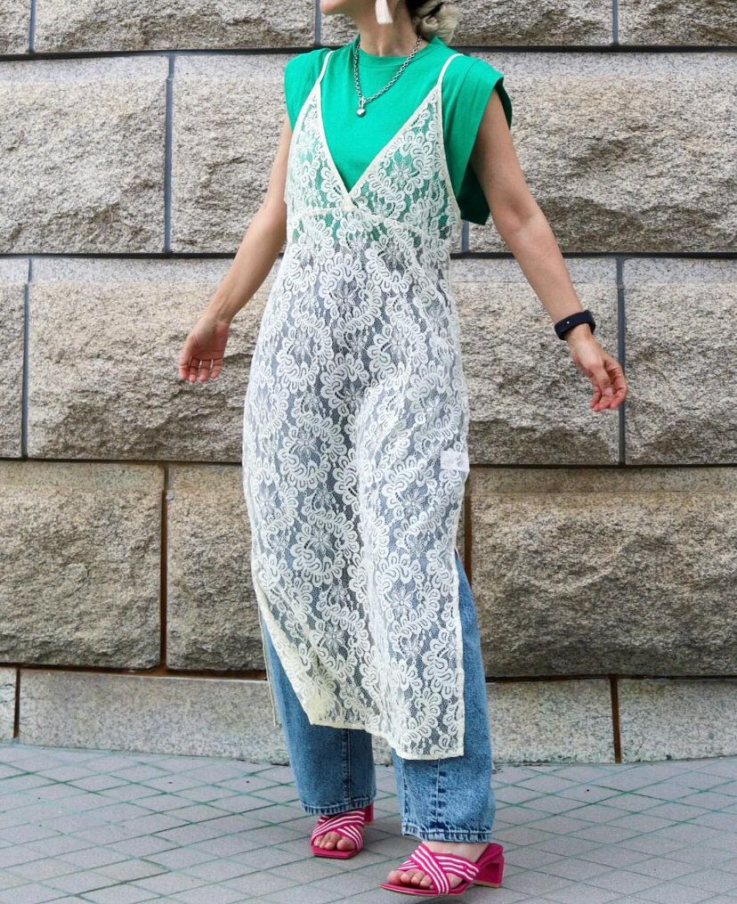 膝からワイドに広がりつつ裾に向けて細くなる独特のデザインは、キャミワンピースなどを重ね着するのにも重宝します。スキニーパンツなどをあわせるよりもトレンド感がプラスされてよりおしゃれさんの仲間入り!