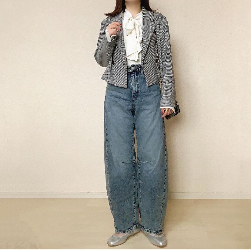 ブラウス+ジャケットといったきれいめのアイテムにバレルレッグジーンズQ+Eを合わせればスタイリッシュなカジュアルコーディネートが完成します。ブラウスをジーンズにインすることで、実際よりも背が高い印象を与えてくれるので低身長さんにもおすすめのコーディネートです。