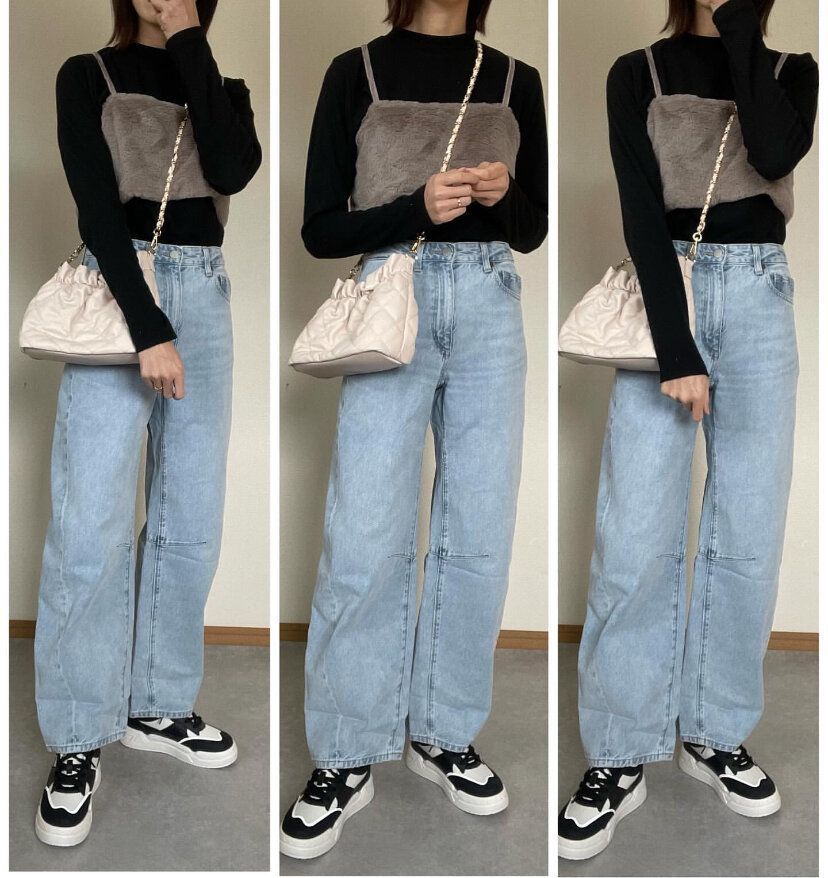 股上が深いジーンズなのでルーズすぎないトップスを合わせることでシルエットにメリハリが出てよりスタイルアップした印象に仕上がります。