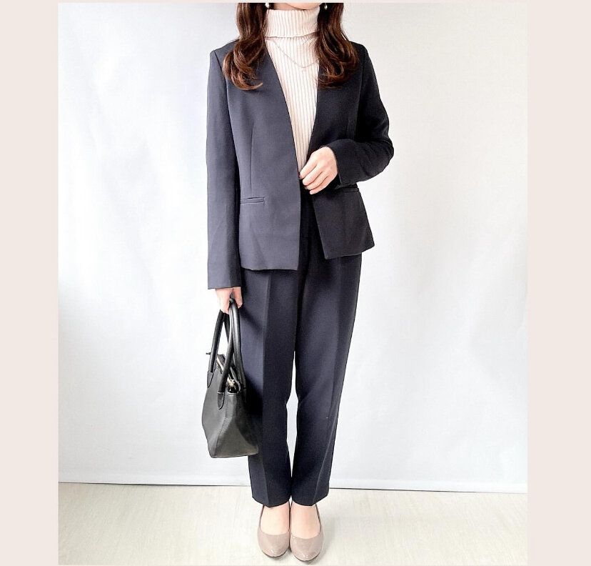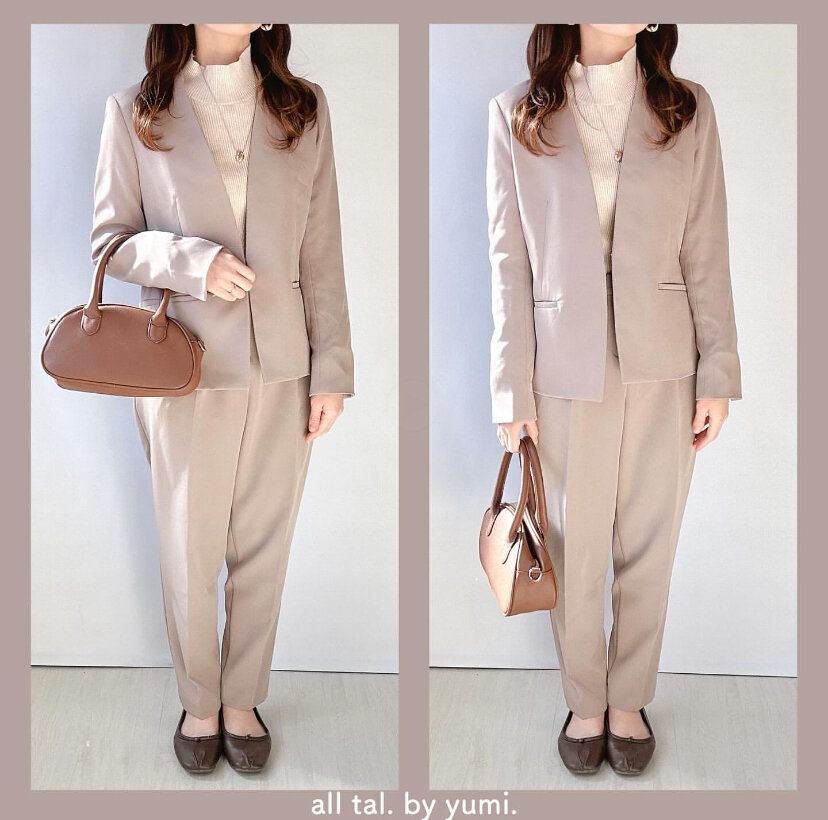 同じデザインでも、色違いだと印象ががらりと変わります。ベージュのセットアップは意外と着用している人が少ないので人と被るのは嫌だな……という人にピッタリ!ジャケットもパンツもベーシックなデザインなので、デイリーファッションでも着回しできてむだがありません。