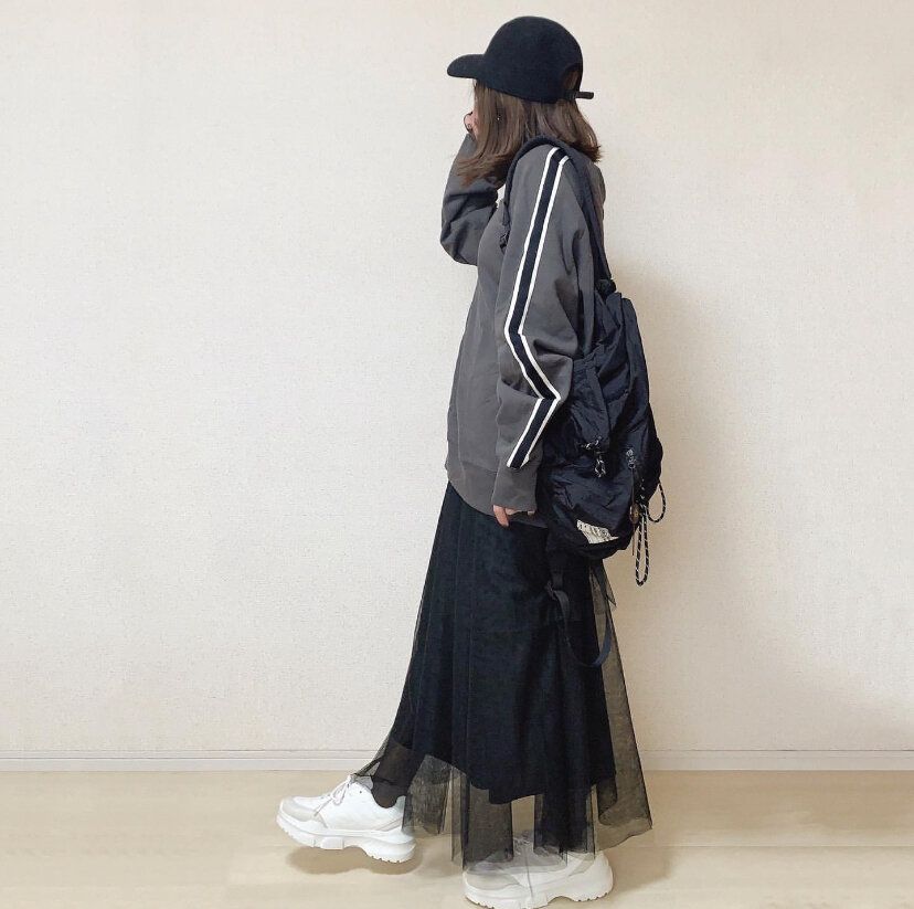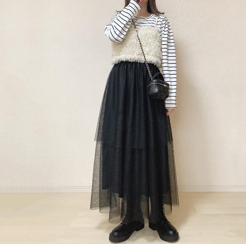 チュールスカートを大人っぽく着用したいならトップスとスカートの色を合わせたワントーンコーディネートにすれば失敗なし。ブラック系にまとめればガーリーになりすぎません。