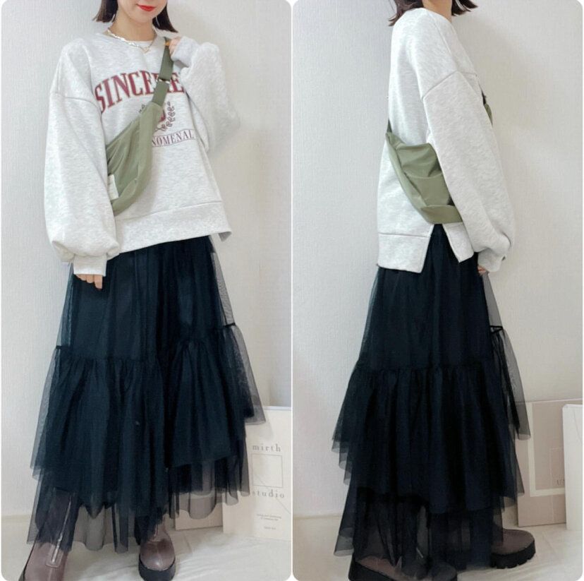 カジュアルなスタイルにチュールスカートを取り入れたいならスウェットがマスト。ガーリーな印象のチュールスカートが苦手な人でもチャレンジしやすいおすすめコーディネート!