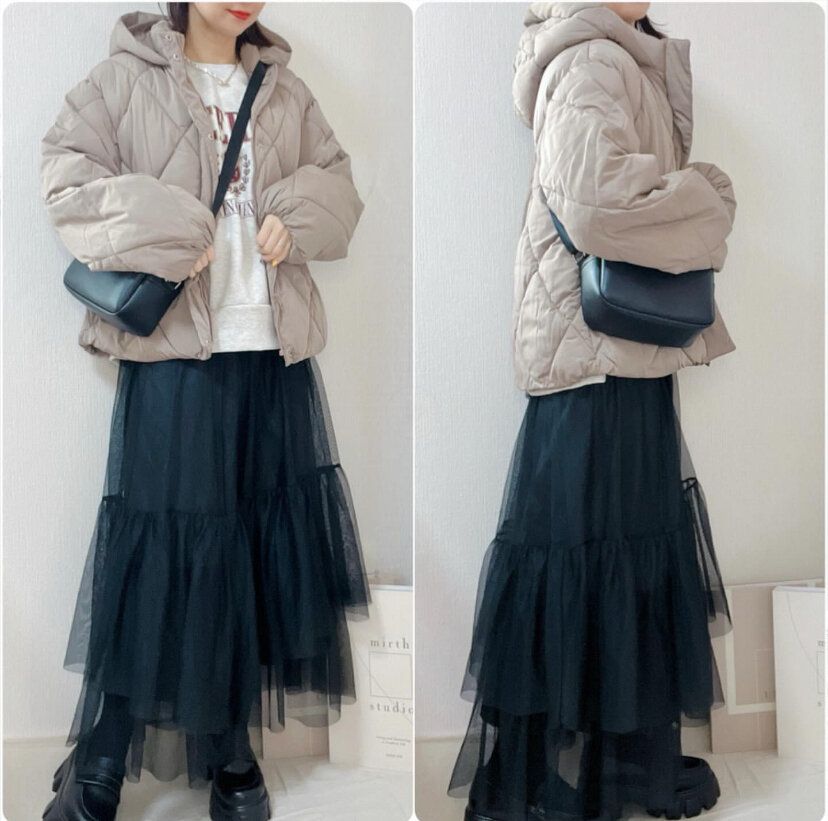 ボリュームのあるチュールスカートを着用したときに合わせるアウターはショート丈がおすすめです。チュールスカートのデザインをしっかりとアピールしてくれますし、着ぶくれしやすい冬のコーディネートにメリハリをプラスしてくれるのでスタイルが悪く見えてしまう……というアウター着用あるあるの悩みを解決してくれますよ。
