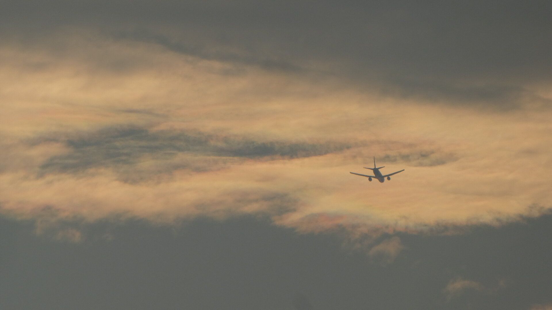 雲と同じくらいの高さを飛ぶ飛行機。周りの雲が虹色に見えるのは「彩雲」という現象で、よく珍しい現象と勘違いされるが、空をよく見ていればほぼ毎日見つけることができる。