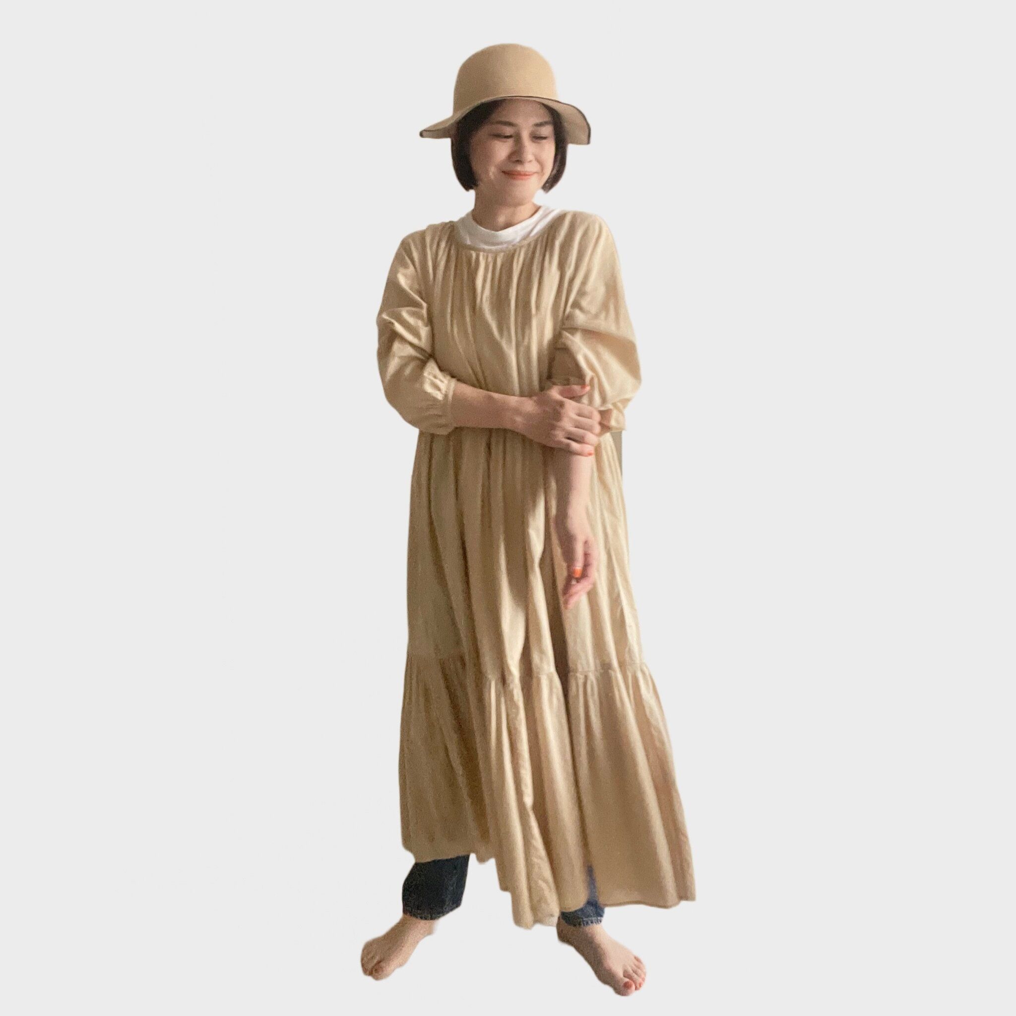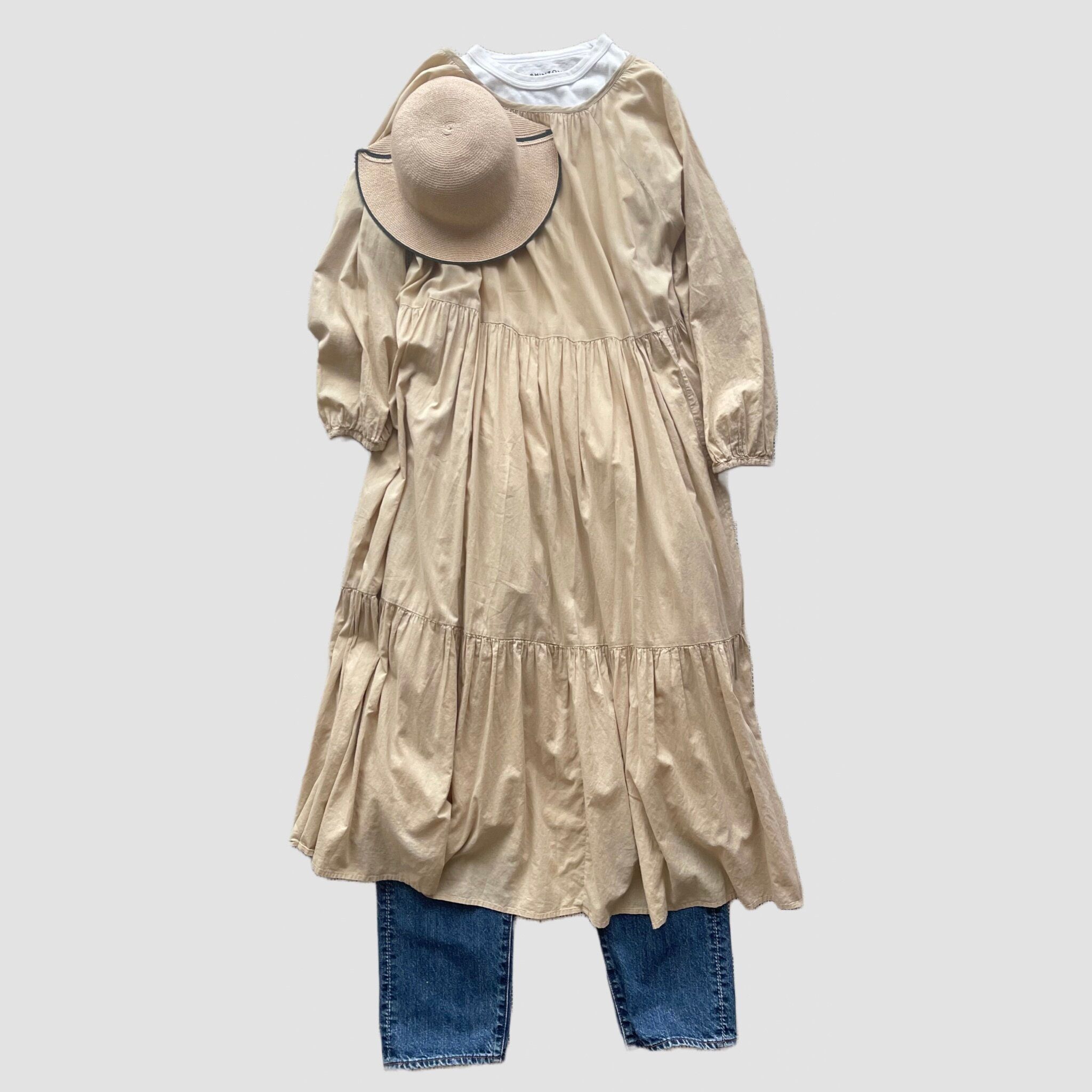 白Tシャツを重ねることで首元はガバッと開かず、デニムがチラリ裾から見えると脚長効果も得られます。このようなベージュのワンピースの場合、肌色と馴染みすぎずに立体的な仕上がりになりますよ。