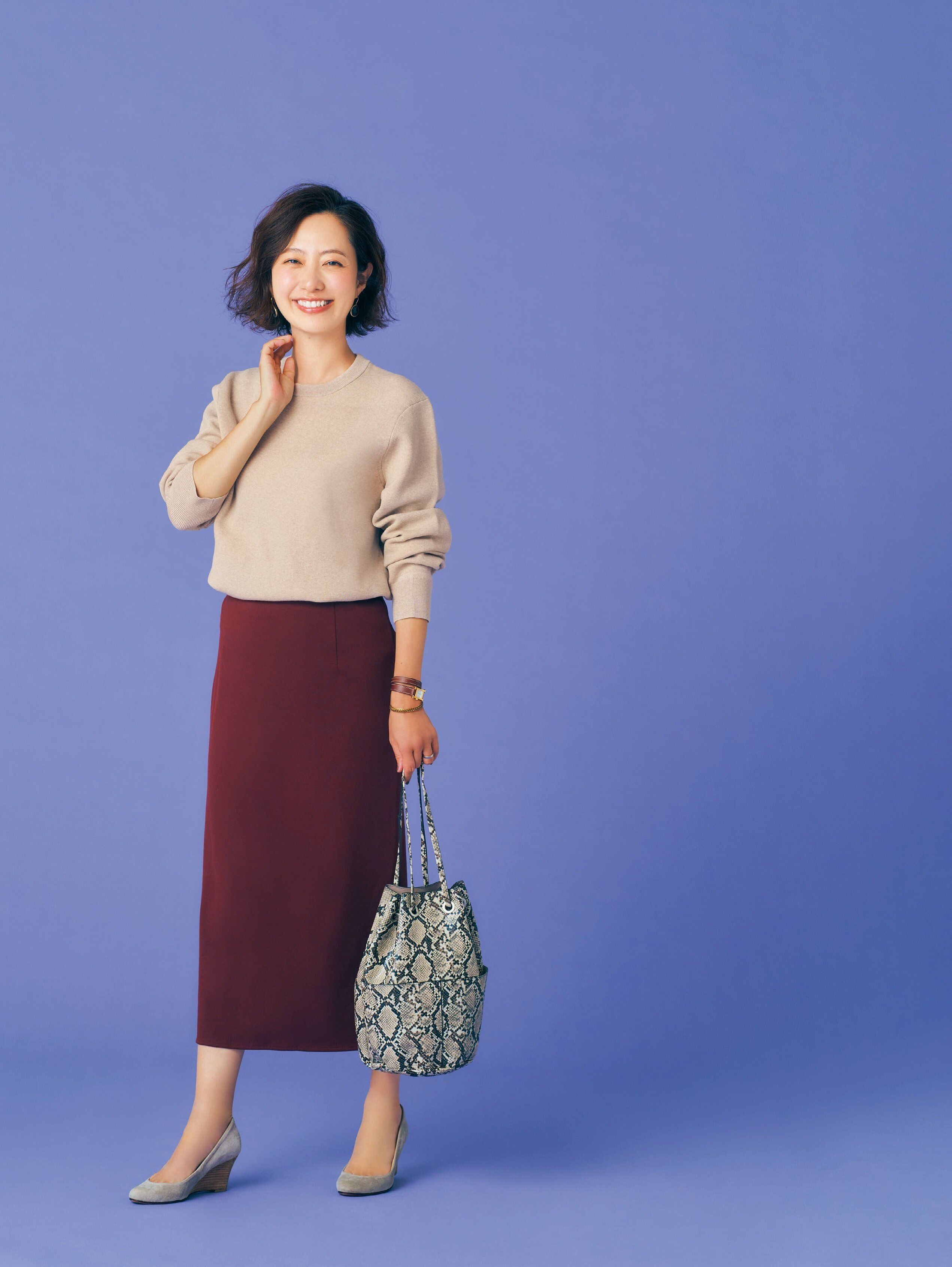 トップが大きめなので、ボトムはタイトに。「ストレッチダブルフェイスナロースカート」(ワイン、ダークグレー、ブラック、ダークグリーン・全4色)¥1,990/ユニクロ その他私物。