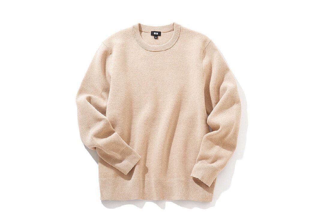 気軽に着られて上品見えする40代にイチオシの逸品。「ウォッシャブルストレッチミラノリブクルーネックセーター」(ベージュ、オフホワイト、ブラック、マスタード、オリーブ、ネイビー・全6色)/ユニクロ