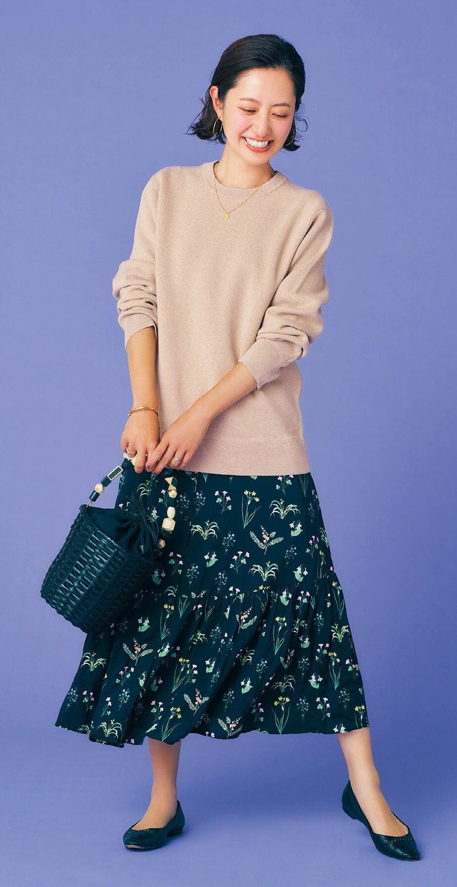 ワンピースの上にゆったりとしたメンズのセーターを重ねれば、スカート見えする新鮮なコーディネートが実現。着回しの幅が広がります。ストンと落ちるハイゲージのセーターだから、スッキリと着こなせるのもポイント。「プリントVネックフレアワンピース(7分袖)」(ブラック[花柄]、ピンク[小花柄]、グリーン[小花柄]・全3色柄)¥4,990/ユニクロ その他私物。
