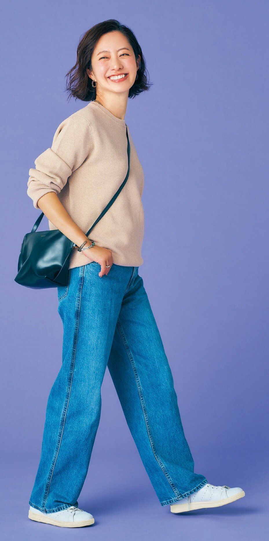 クルーネックのセーターは、ロンT感覚で使えてジーンズとの相性も抜群。ド定番のコーディネートだけに、サイズ感が大切。トップスもボトムスも、ちょっとゆるめなのが今年らしいバランスです。モノトーンの小物を合わせれば、大人っぽい印象に仕上がります。「バギージーンズ」(ブルー、オフホワイト、ネイビー、ダークグレー・全4色)¥3,990/ユニクロ その他私物。