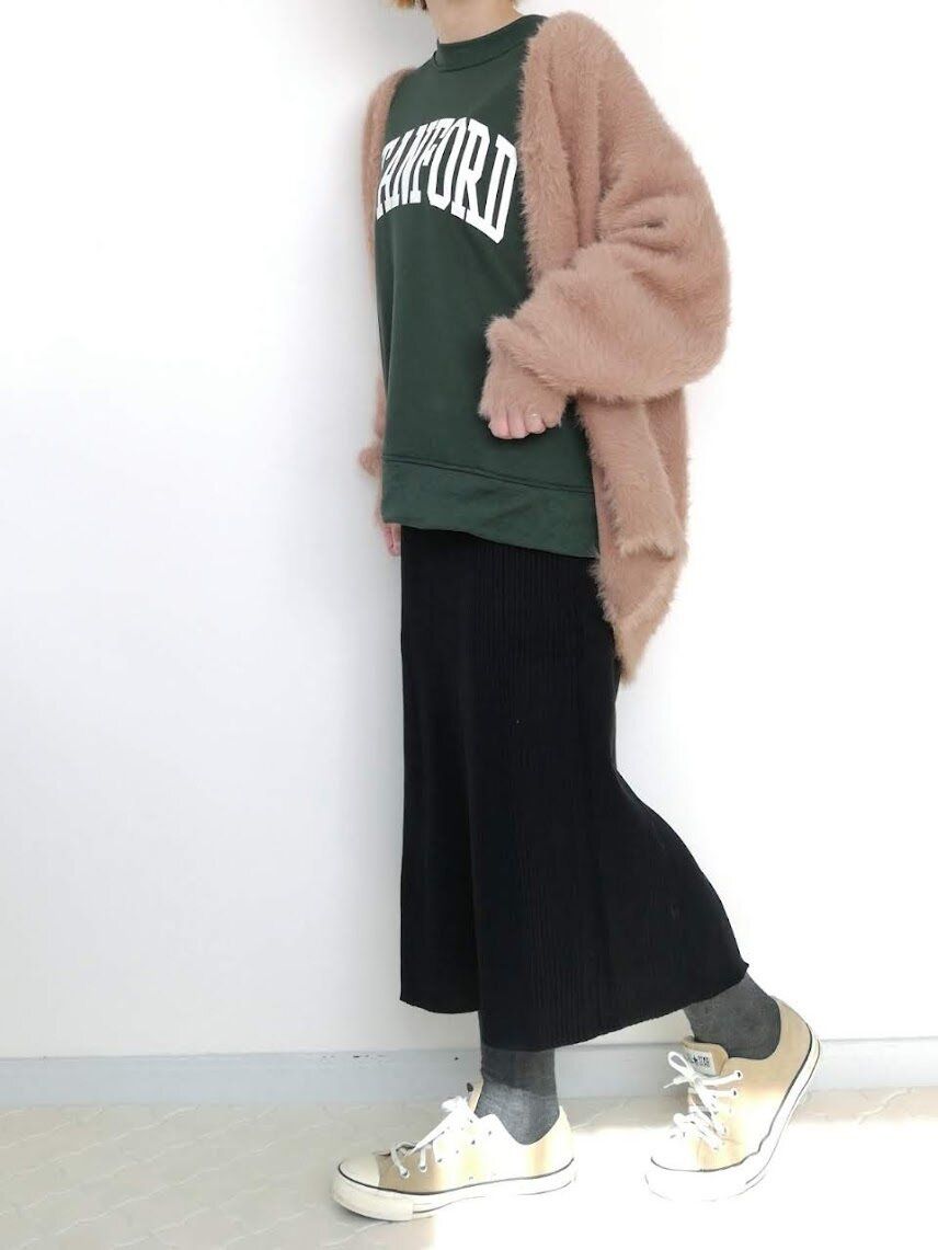 ダークカラーのカジュアルコーデに、ふわもこなベージュのカーディガンで柔らかさをプラス!