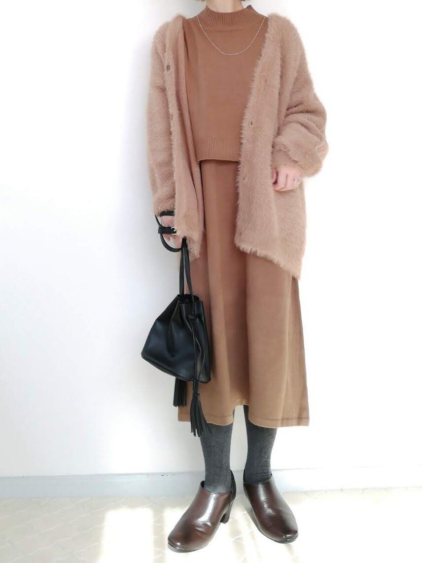 ブラウンのワンピースに羽織ったワントーンコーデ。