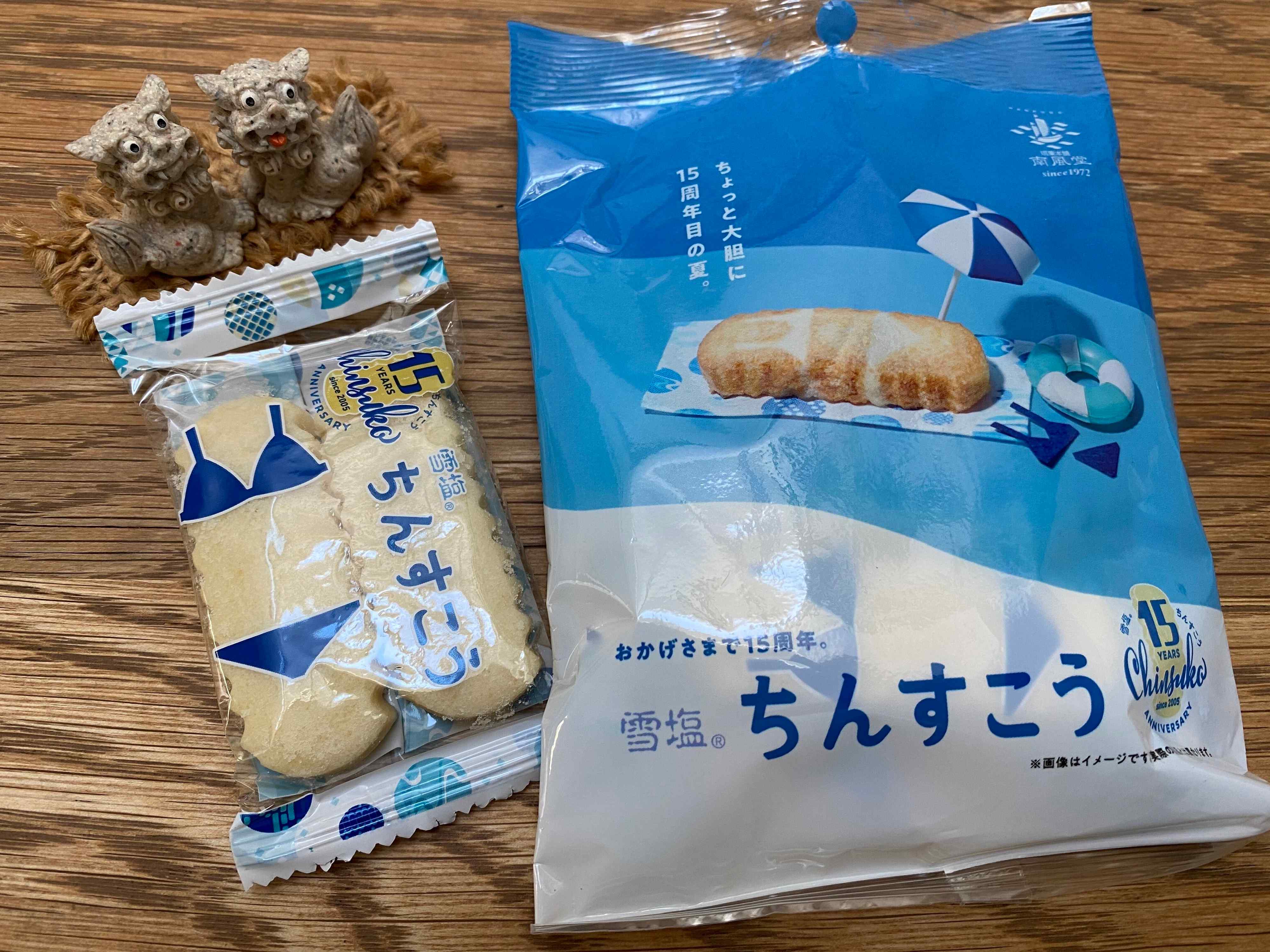雪塩ちんすこうは今年15周年を迎え、期間限定パッケージが登場しています。ビキニを着たちんすこう。夏らしくってかわいいパッケージ。