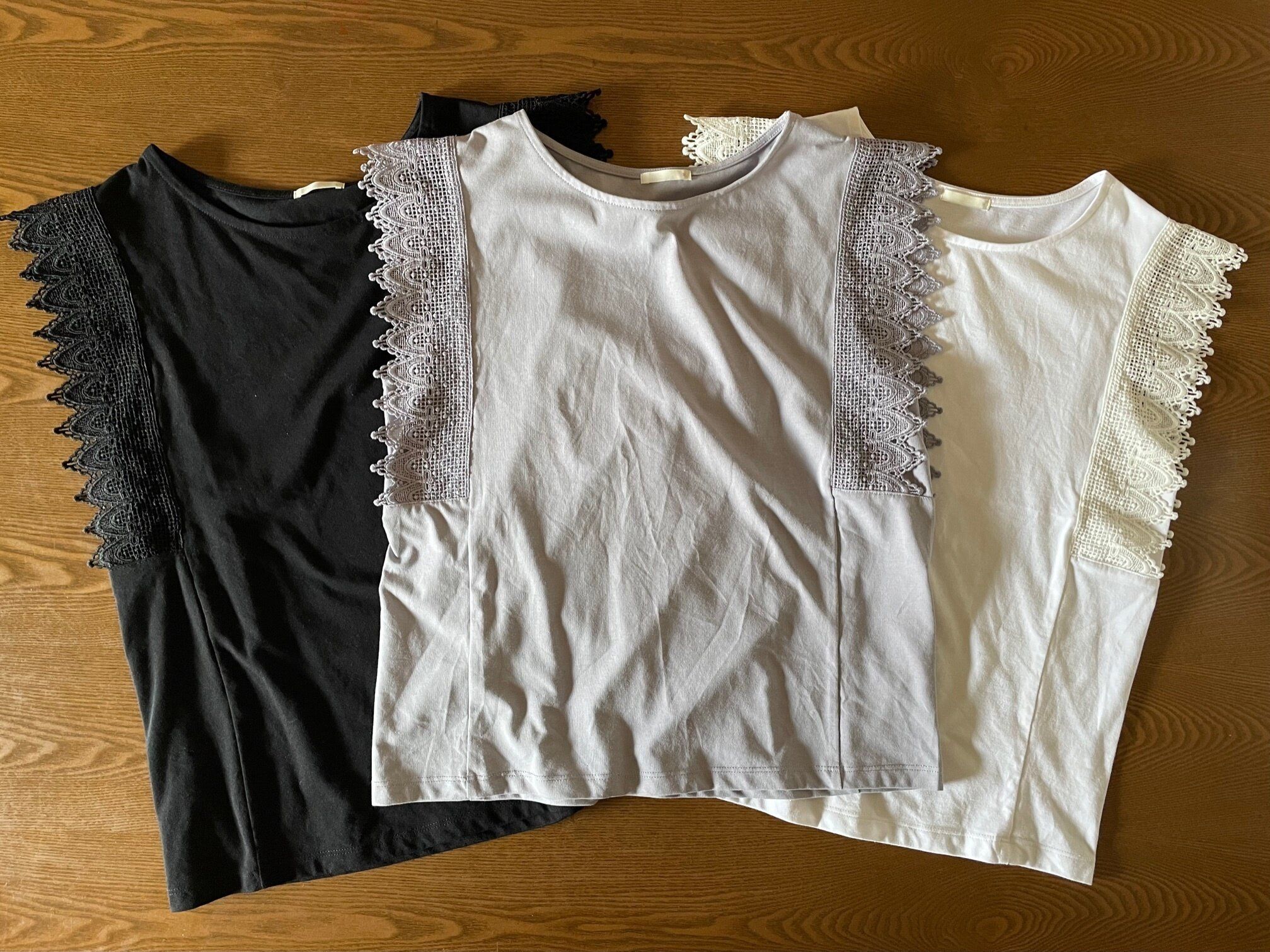 そして、なんと言っても嬉しいのがその価格。なんと1枚590円!商品名は「レーストリムデザインT」です。色は、オフホワイト、ブラック、ライトパープルの3色展開。色で迷った私は結局3色買いしてしまいました。