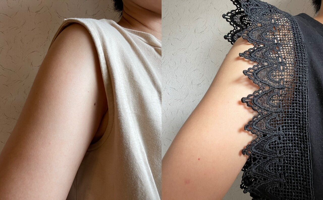 「ノースリーブはちょっと二の腕が気になって…。」と敬遠してしまいますが、こちらは肩回りや脇がレースでうまく隠れるので、気になる二の腕をカバーしてくれます。「腕全開!」という感じにはならなずに、上品にノースリーブが着られますよ。