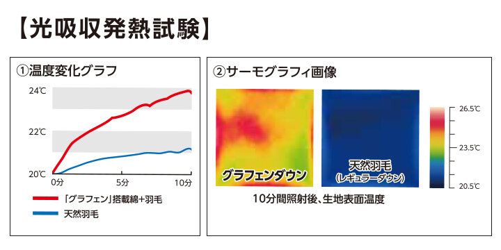 光を吸収してダウンそのものが穏やかに発熱し、天然羽毛100%に比べて、2倍ほどの速さで温度が上昇。暖かさを保持するのはもちろん、冷えた体を「速暖」してくれるのです。