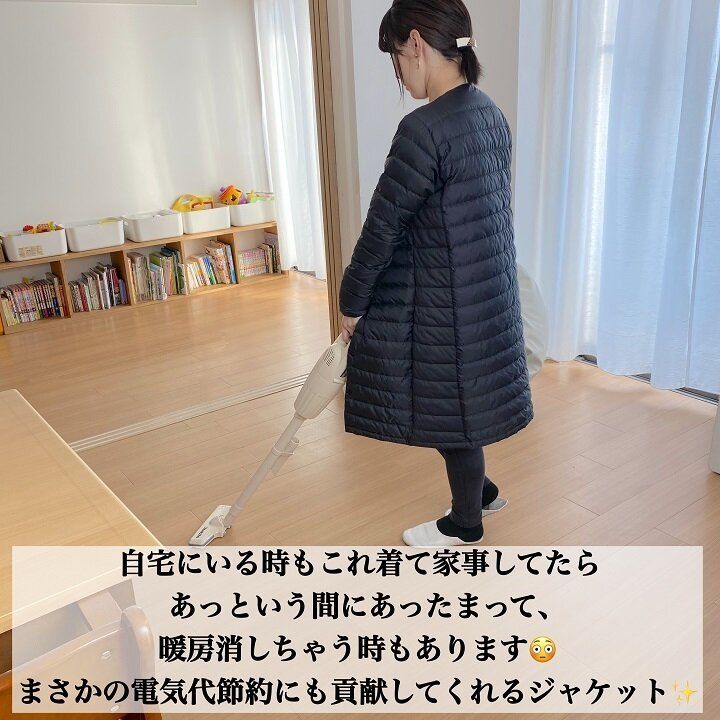「ヒートクロス ヘキサゴンダウンを着て家事をしてたらあっという間に暖まって、暖房を切っちゃいました。まさかの電気代節約にも貢献してくれるジャケットです!」
