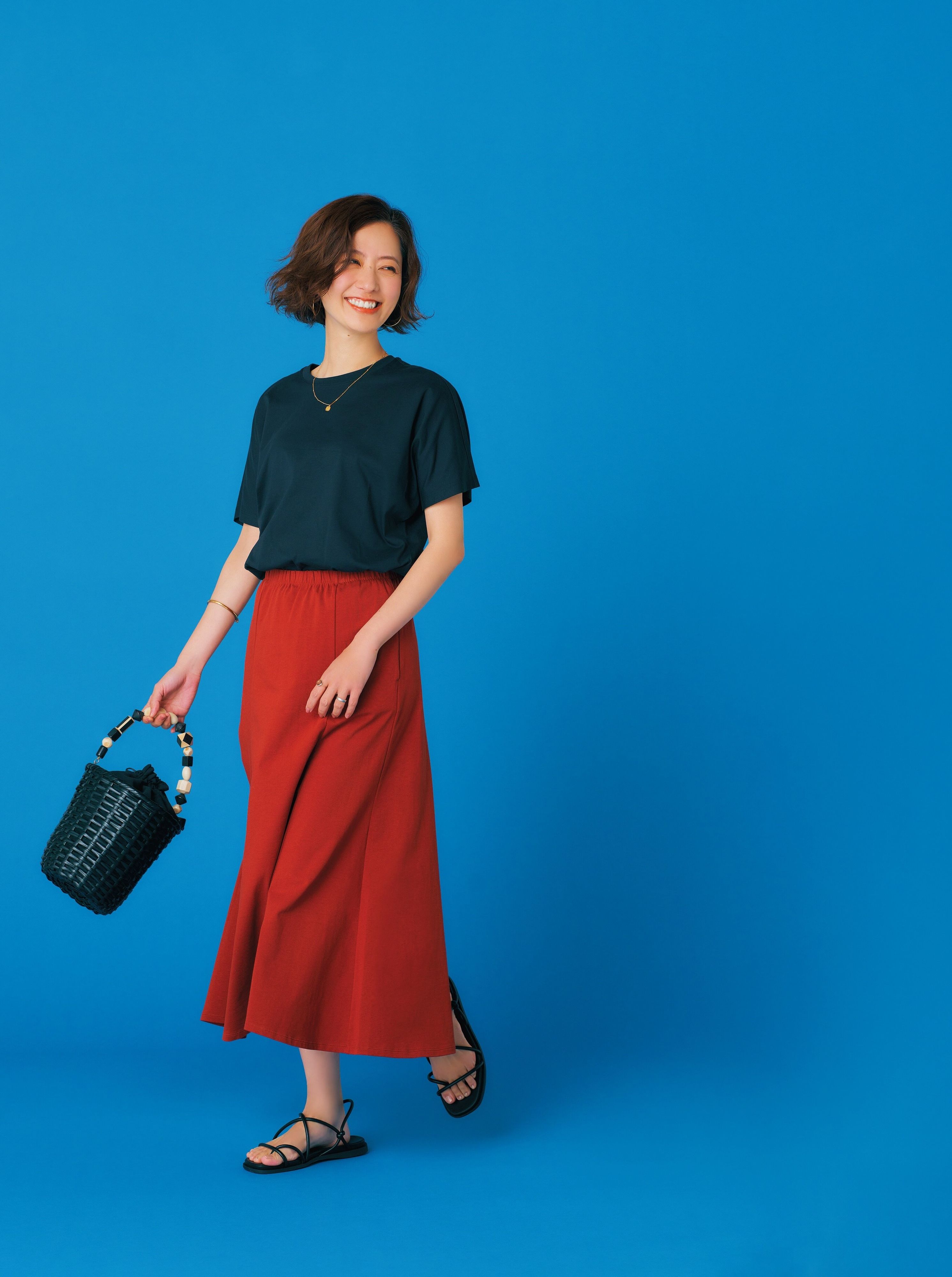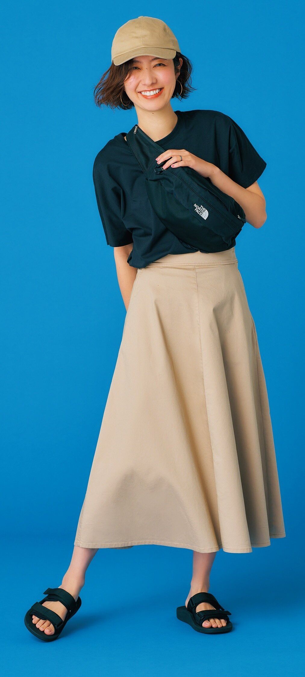 涼しく着られるAラインスカートとTシャツのラクチンコーデ。小物は服と同じカラーを拾うことで、スッキリとした印象に仕上がる。「ストレッチコットンブレンドサーキュラースカート」(ベージュ、オフホワイト、オリーブ、ネイビー・全4色)¥3,990、「UVカットツイルキャップ」(ベージュ、ダークグレー、ブルー、ネイビー・全4色)¥1,990、「2ストラップサンダル」(ブラック、オリーブ・全2色)¥2,990/ユニクロ その他私物