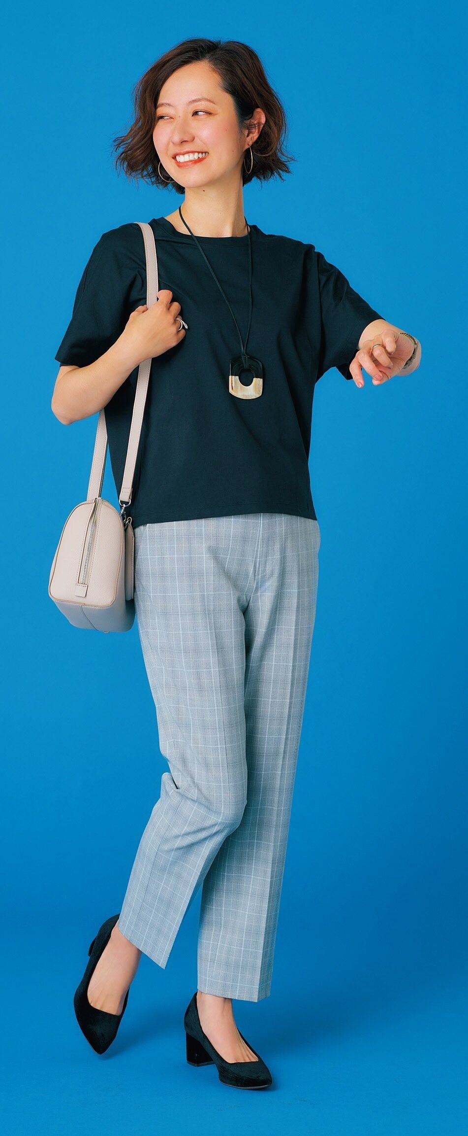 いわゆる”体操着型Tシャツ”ではないので、オンスタイルにも活用可能。シンプルなパンツと合わせるだけで、オフィス仕様に。「スマートアンクルパンツ グレンチェック」(グレー、ベージュ・全2色)¥3,990、「レザータッチ2WAYボストンバッグ」(ナチュラル、ブラック・全2色)¥2,990/ユニクロ その他私物