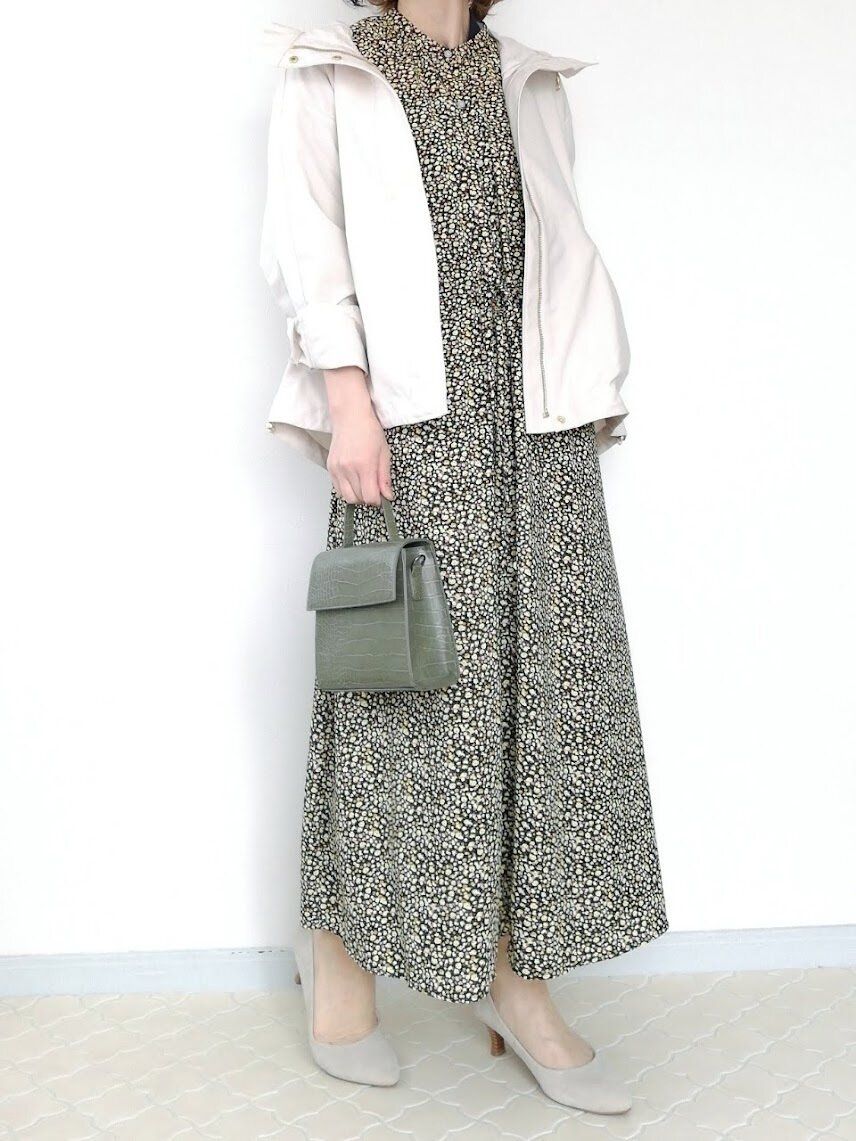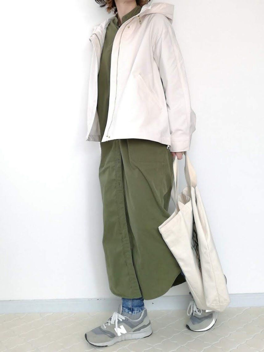 1枚で着るとのっぺり見えしがちなシャツワンピは、清潔感ある白のマウンテンパーカーで鮮度アップ!