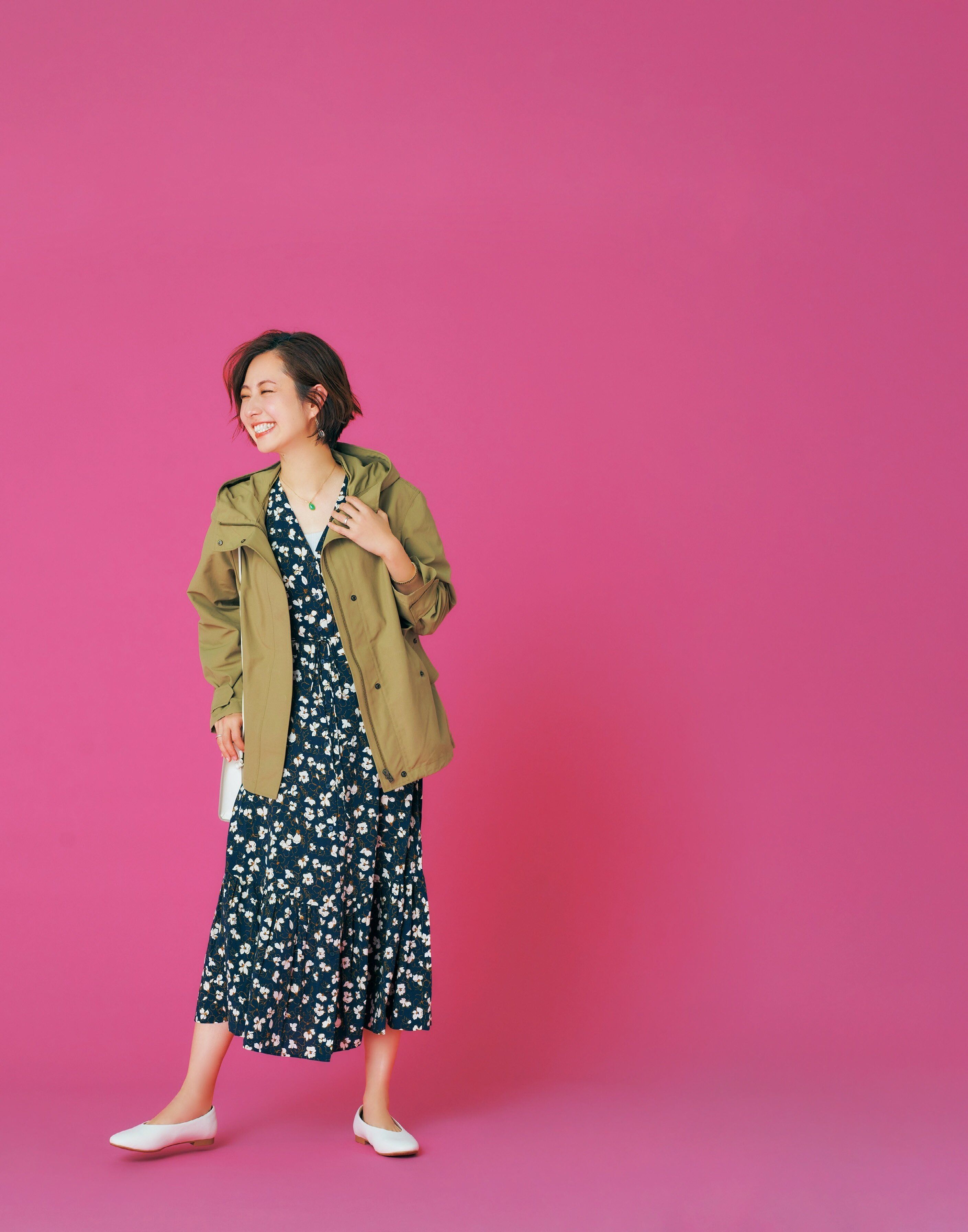 花柄のワンピースを、ほどよくカジュアルダウン。