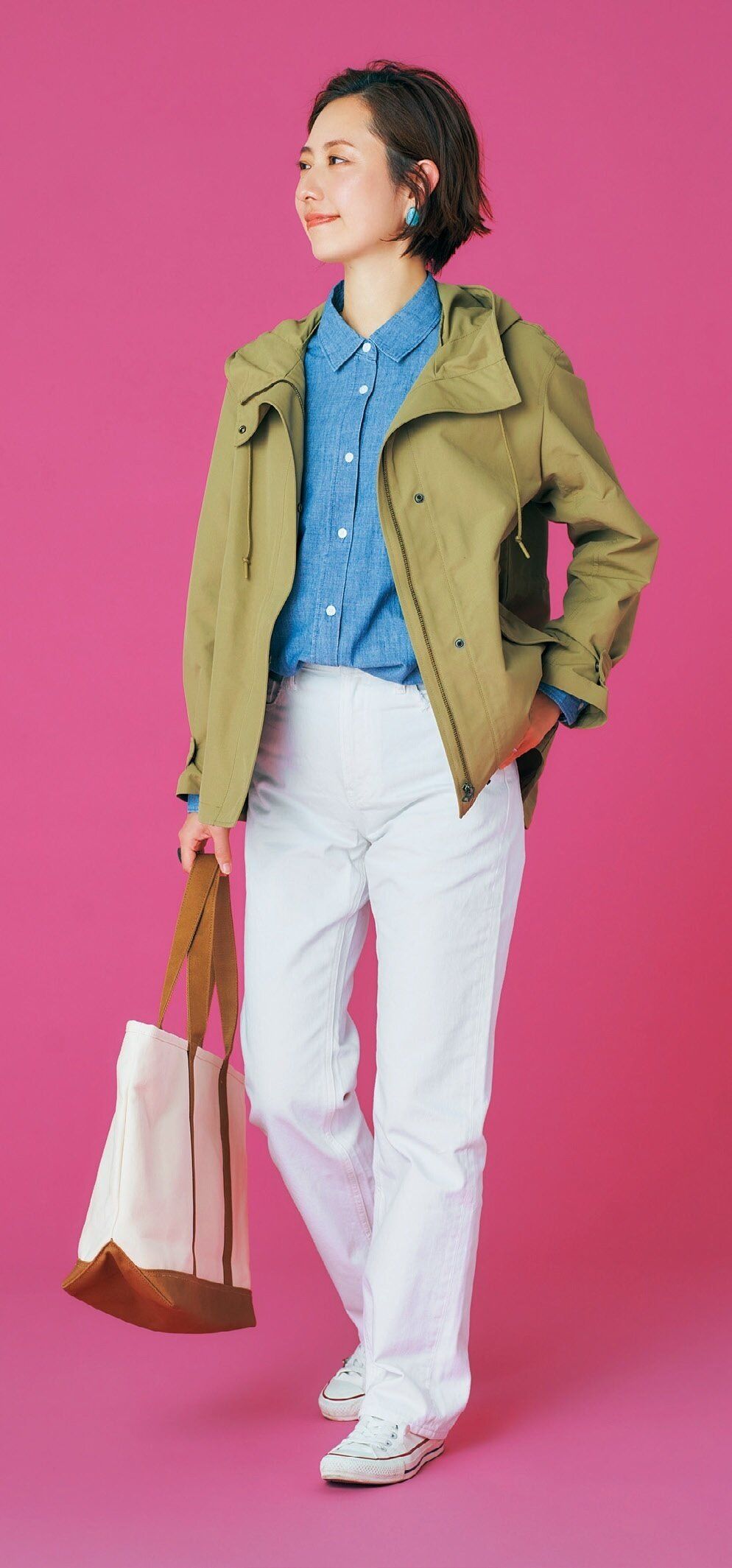 全体を明るいトーンでそろえることで、春らしいコーデに。「コットンシャンブレーロングシャツ」(ブルー・全1色)¥2,990、「ストレートハイライズジーンズ」(ホワイト、ライトブルー、ブルー・全3色)¥3,990、「キャンバストートバッグ」(ブラウン・全1色)¥2,990/ユニクロ その他私物