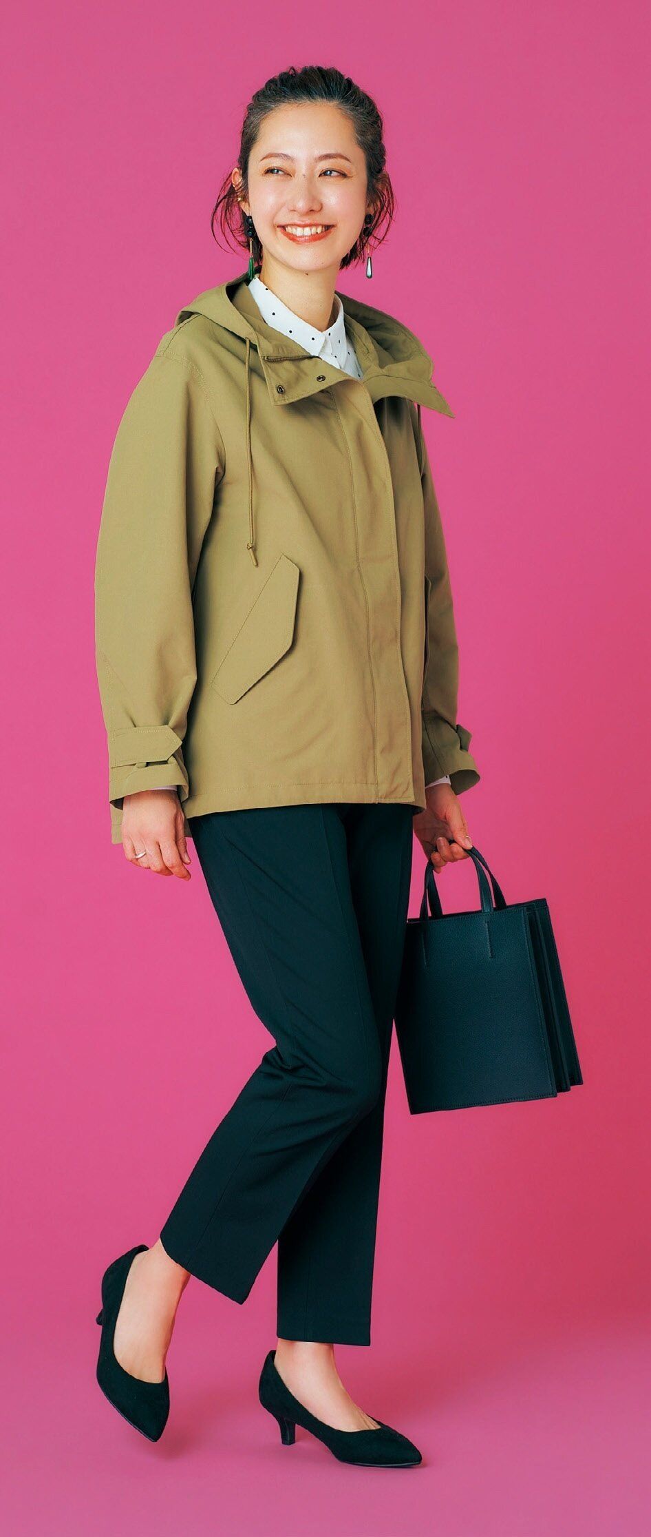 首もとを少し開けてブラウスの襟を見せると抜け感アップ。「レーヨンプリントブラウス」(オフホワイト、ブラック・全2色)¥2,990、「スマートアンクルパンツ」(ブラック、ホワイト、ライトグレー、グリーン、ネイビー・全5色)¥3,990、「コンフィールタッチパンプス」(ブラック、ベージュ・全2色)¥2,990、「レザータッチスクエアショルダーバッグ」(ブラック、ベージュ、ナチュラル・全3色)¥2,990/ユニクロ その他私物