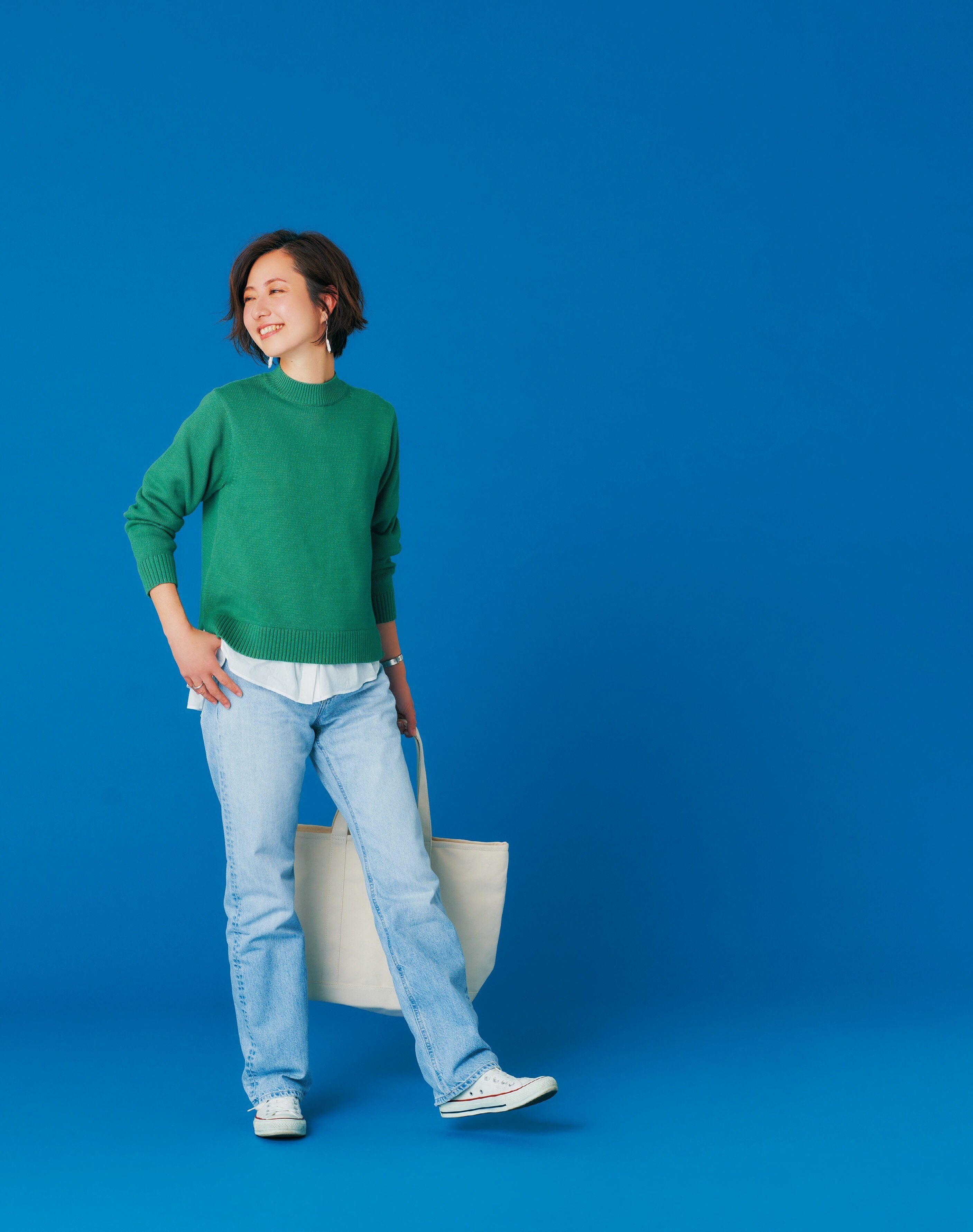 ニット+ブルージーンズのシンプルコーデにブラウスをプラスすることで、今年らしい着こなしに。「ストレートハイライズジーンズ」(ブルー、ホワイト、ライトブルー・全3色)¥3,990、「コットンギャザーブラウス」(ホワイト、ブラック、オレンジ・全3色)¥2,990、「ツールトートバッグ」(ナチュラル、ブラック・全2色)¥2,990/ユニクロ その他私物