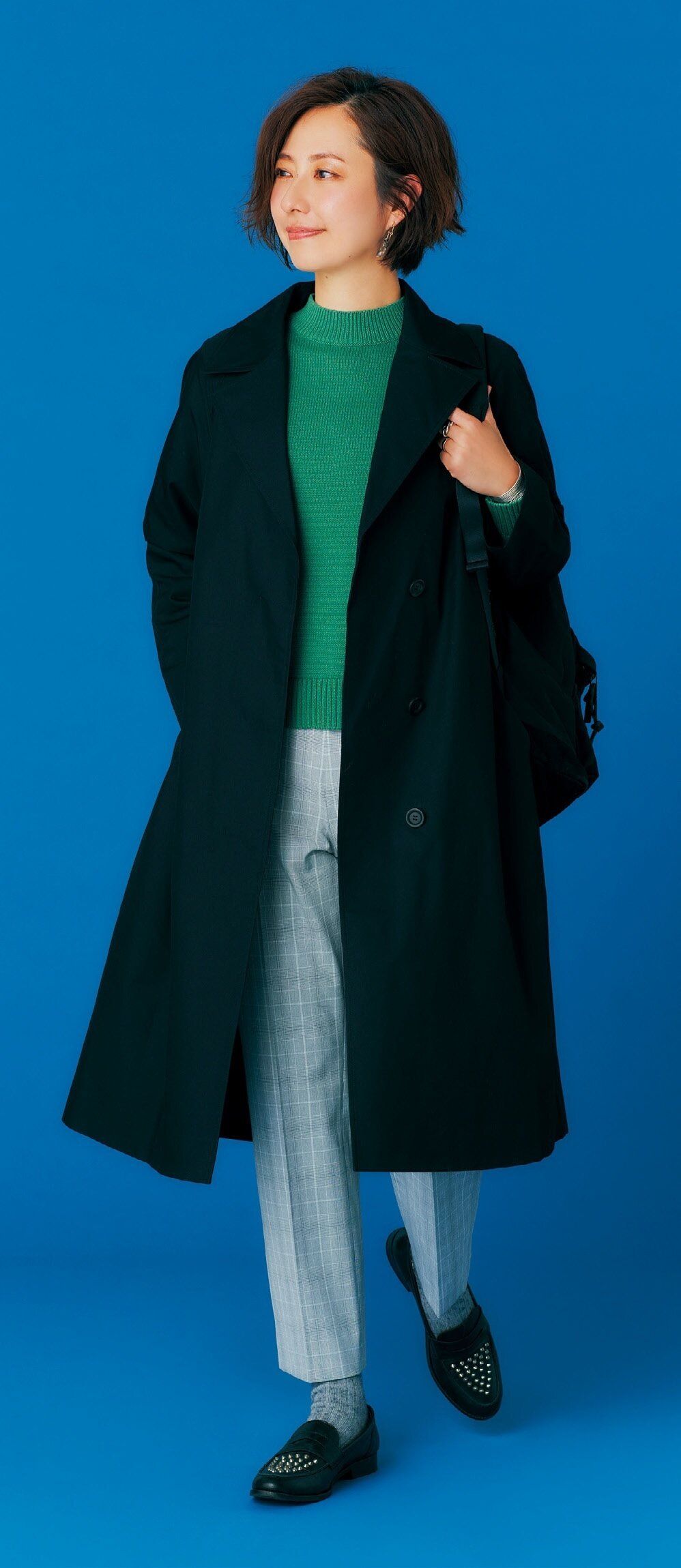 アウターの定番色である黒に映えるグリーン。チェックのパンツと合わせて、キレイめカジュアルに。「トレンチコート」(ブラック、ベージュ・全2色)¥7,990、「スマートアンクルパンツグレンチェック」(グレー、ベージュ・全2色)¥3,990/ユニクロ その他私物