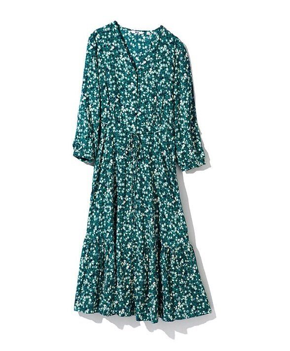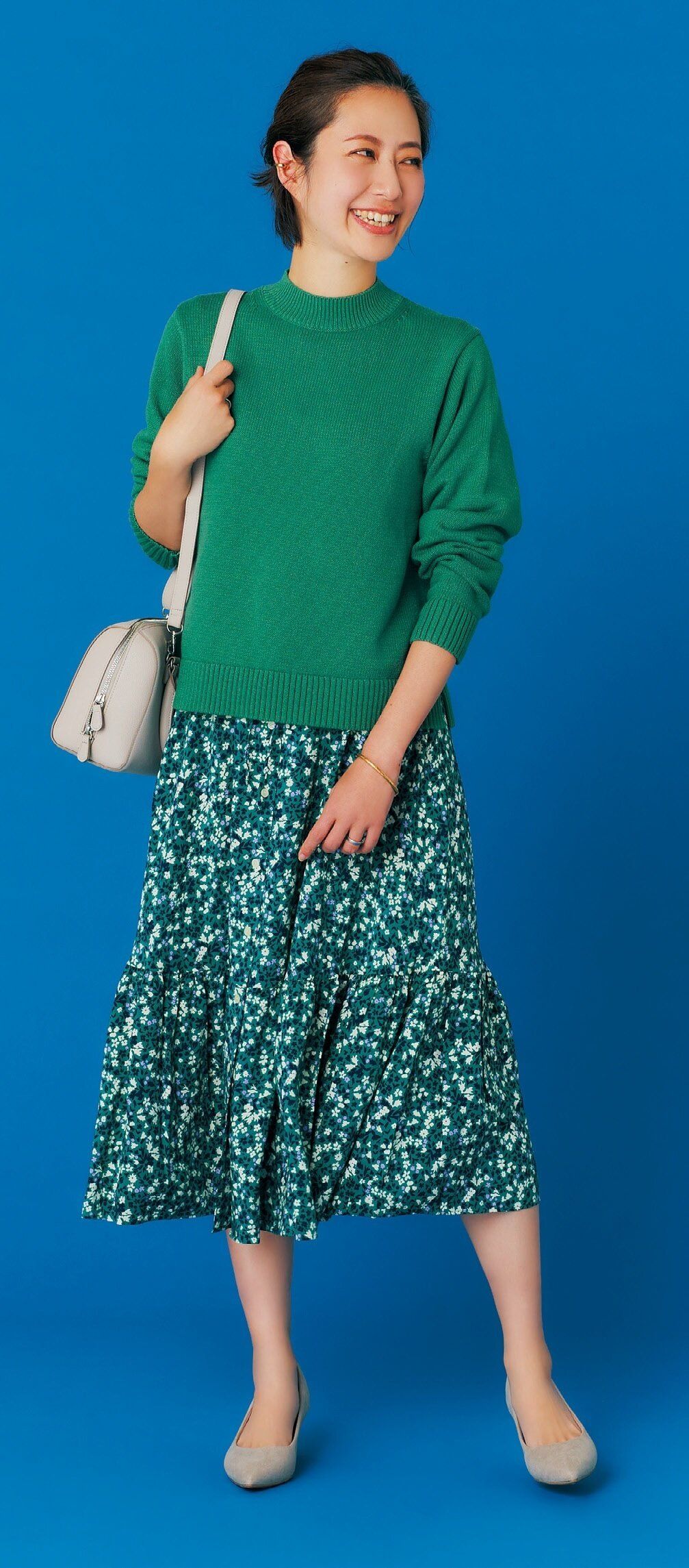 薄手ワンピに重ね着をして防寒。全身ワントーンでまとめれば、40代でも花柄をイタくならずに着こなせる。「プリントVネックフレアワンピース」(グリーン、ブルー、ネイビー、パープル・全4色柄)¥3,990、「レザータッチ2ウェイボストンバッグ」(ナチュラル、ブラック・全2色)¥2,990、「コンフィールタッチパンプス」(ベージュ、ブラック・全2色)¥2,990/ユニクロ その他私物