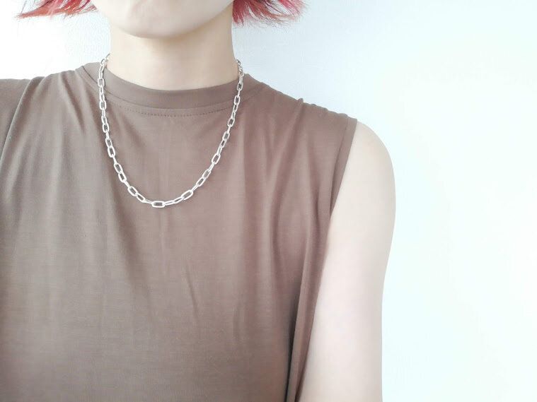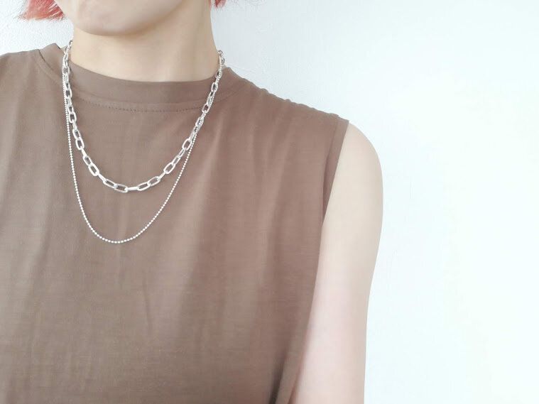 ごつめのチェーンがモードな雰囲気。ロゴTや、シンプルな無地Tに映えそうです。