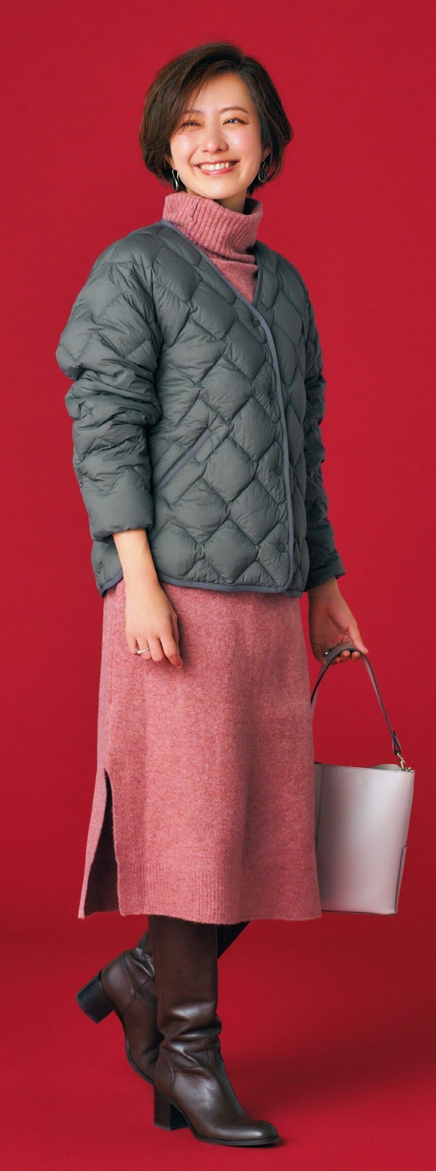 薄くて首元がスッキリしているジャケットは、厚手のトップスやワンピースも合わせやすい。冬の万能アウターとして重宝。「スフレヤーンタートルネックワンピース」(ピンク、ダークグリーン、グレー、ダークグレー・全4色)¥3,990/ユニクロ その他私物