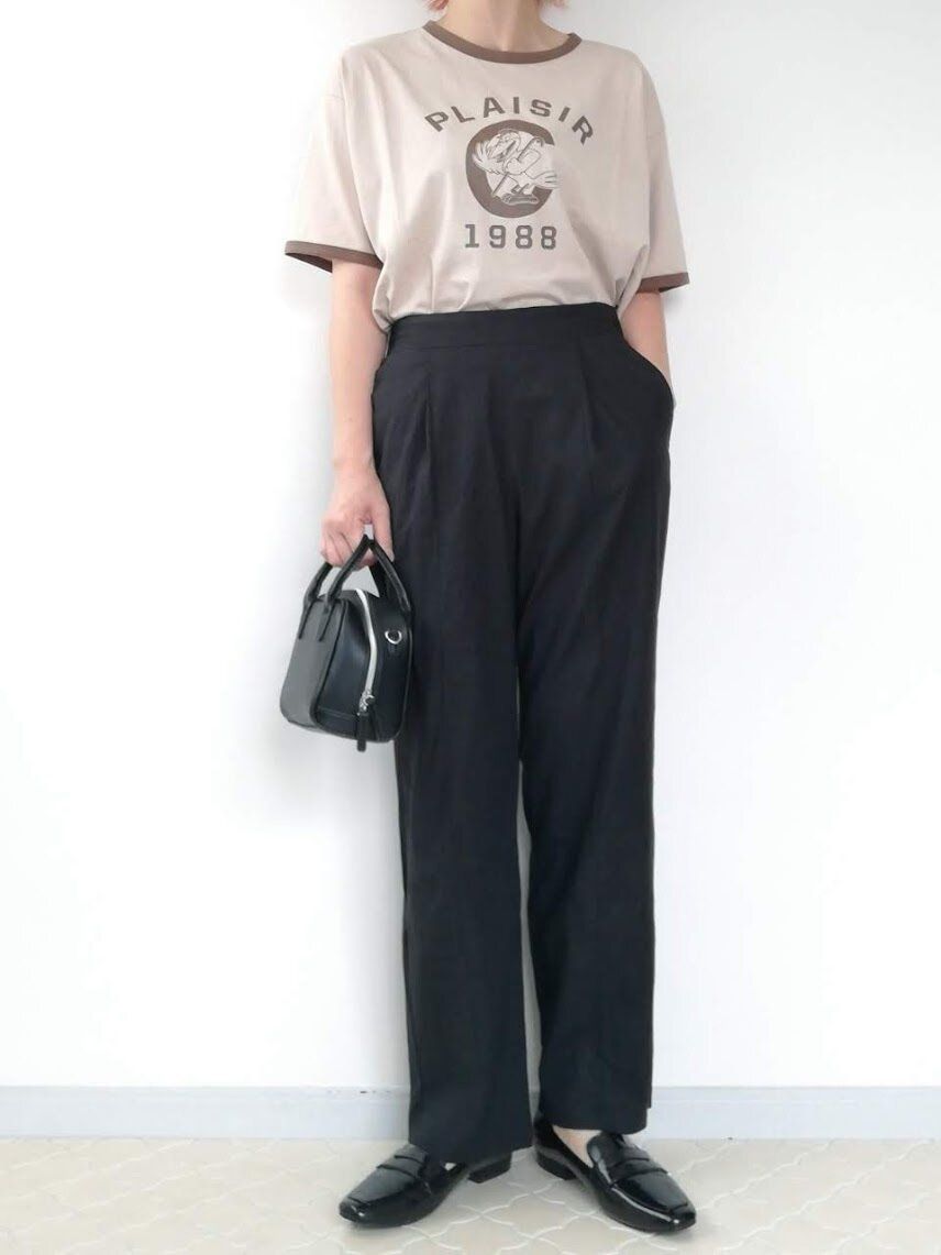 カジュアルなリンガーTは、デニムよりきれいめなパンツに合わせるほうが大人っぽく見えます。どんなトップスもまとめてくれる包容力のある黒パンツは、アラフォーの味方です!