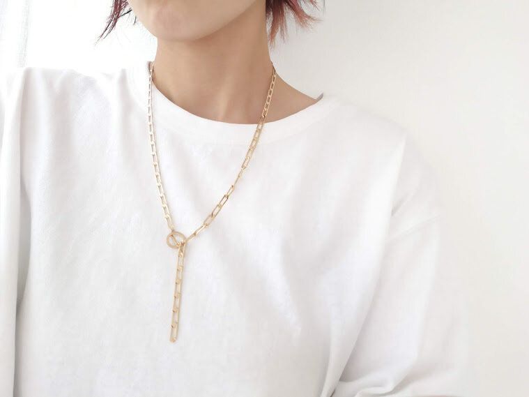 エッジの効いた太めチェーンが存在感のあるY字ネックレス。アンティーク加工のゴールドで、ギラギラしすぎず落ち着いた印象で着けることができます。