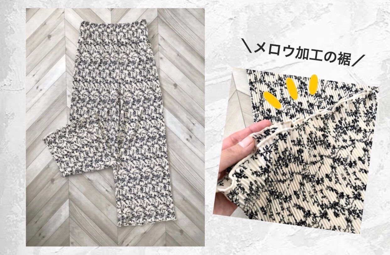 しまむらでは単色の他に、ペイズリーやタイダイなど柄のプリーツパンツもたくさん出ているんですが、こういう可愛らしい花柄は初めて見ました!