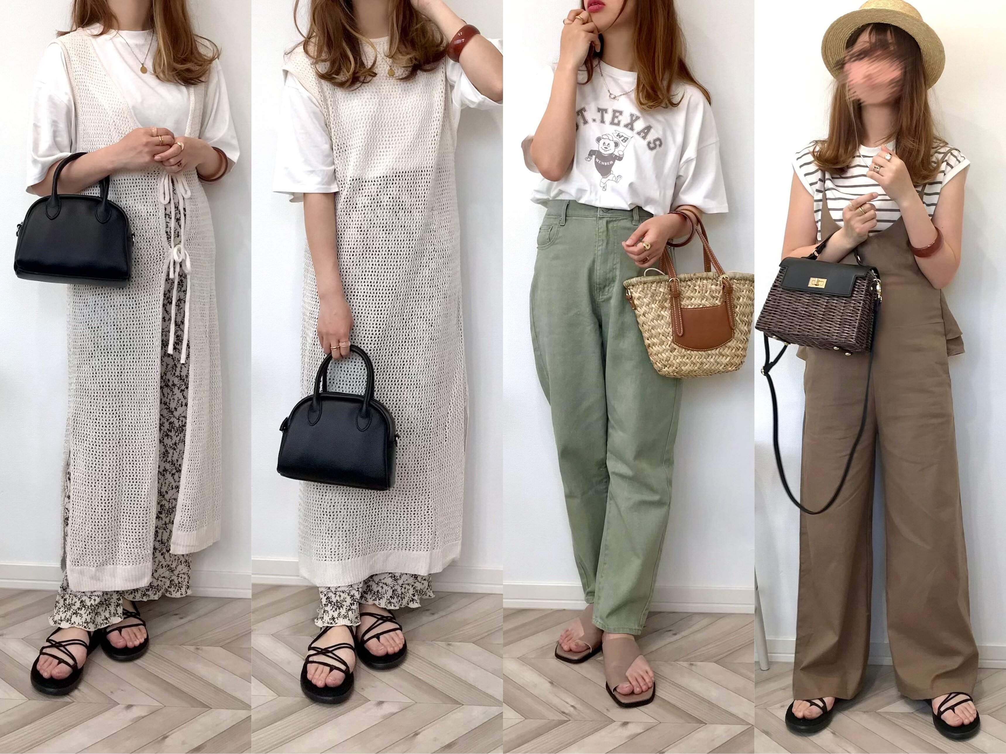 先ほど紹介したアイテムをそれぞれ使ってコーデを組んでみました。右側2つのコーデで持っているバッグも先日しまむらで購入した高見えバッグです。