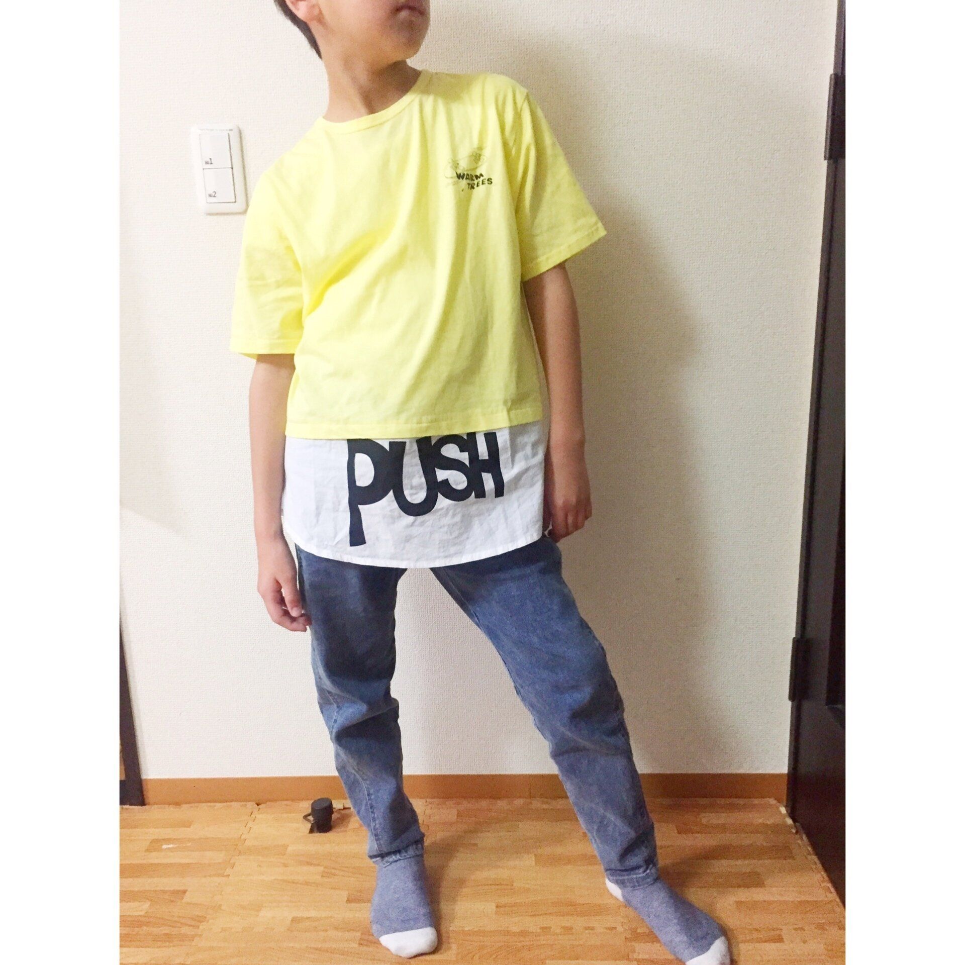 重ね着風のTシャツは1580円(税込み)、デニムパンツは2980円(税込み)。