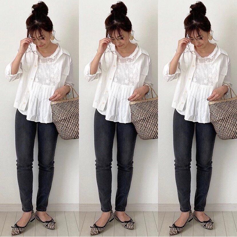 レースのブラウスにシャツジャケットで大人可愛いきれいめカジュアルなコーディネート。甘めのブラウスの可愛さ、ジャケットのカッチリ感も、デニムでカジュアルに仕上げてあげるとこなれた印象に。