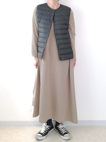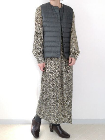 柄ワンピースに合わせることで、部屋着感を回避!ベストと近いトーンの色みで合わせることで、スッと全体にまとまりが出て◎。