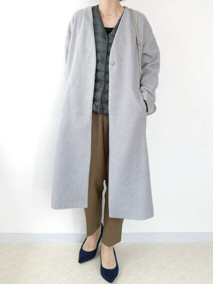 通勤スタイルは、トレンドのロングコートを合わせるのがおすすめ。きちんと感とトレンド感が両方手に入ります。インのダウンベストでほどよくカジュアルダウン。こなれた印象の通勤コーデに!きれいめに着たいときは、Vネックにすると◎。